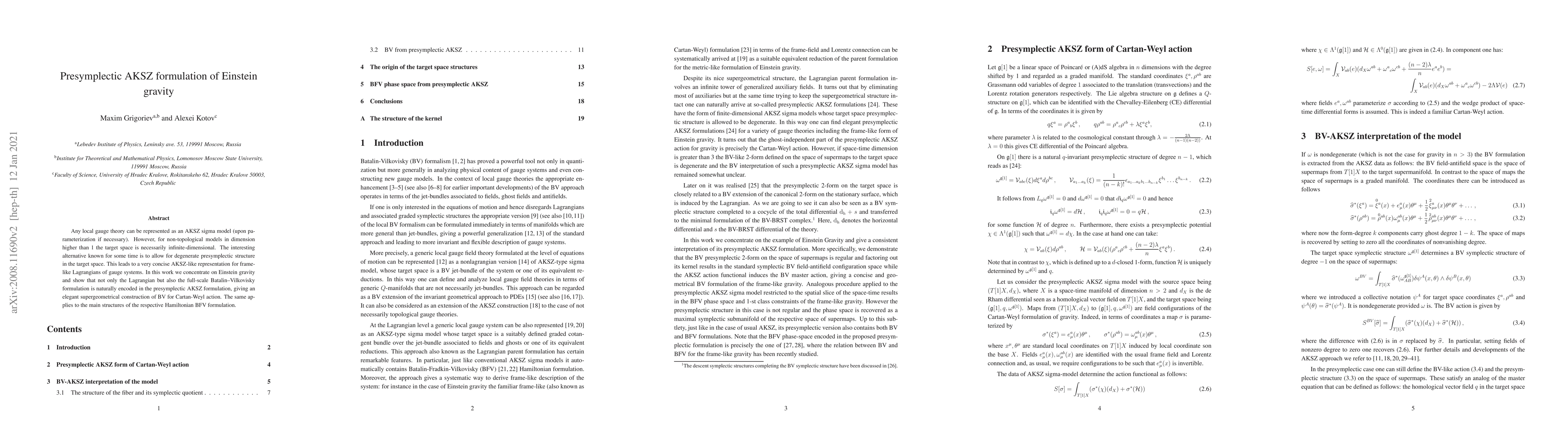 Any local gauge theory can be represented as an AKSZ sigma model (upon parameterization if necessary). However, for non-topological models in dimension higher than 1 the target space is necessarily infinite-dimensional. The interesting alternative known for some time is to allow for degenerate presymplectic structure in the target space. This leads to a very concise AKSZ-like representation for frame-like Lagrangians of gauge systems. In this work we concentrate on Einstein gravity and show that not only the Lagrangian but also the full-scale Batalin--Vilkovisky formulation is naturally encoded in the presymplectic AKSZ formulation, giving an elegant supergeometrical construction of BV for Cartan-Weyl action. The same applies to the main structures of the respective Hamiltonian BFV formulation.