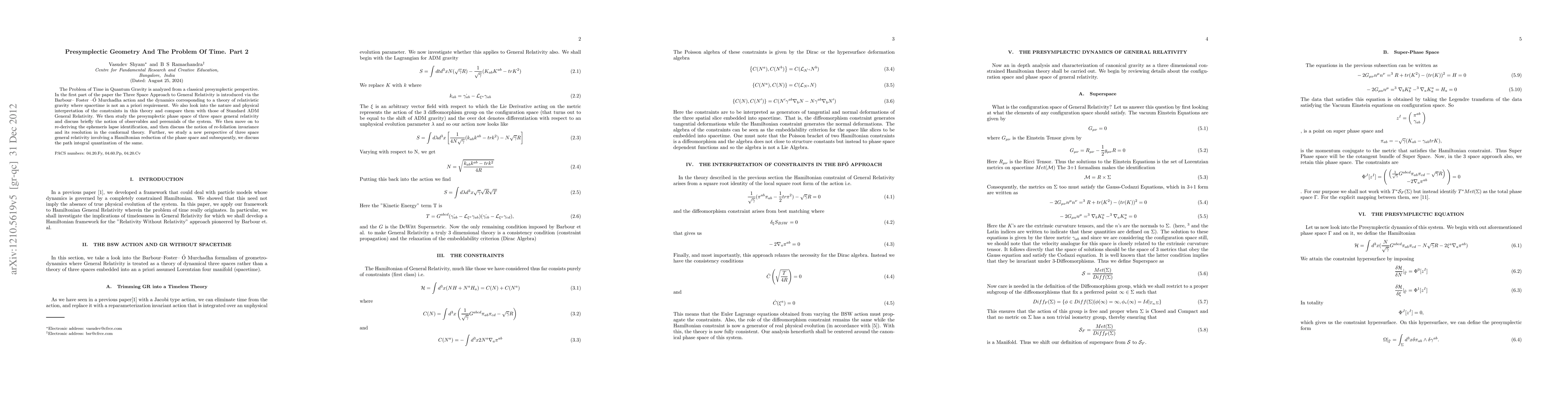 The Problem of Time in Quantum Gravity is analyzed from a classical presymplectic perspective. In the first part of the paper the Three Space Approach to General Relativity is introduced via the Barbour-Foster-\'O Murchadha action and the dynamics corresponding to a theory of relativistic gravity where spacetime is not an a priori requirement. We also look into the nature and physical interpretation of the constraints in this theory and compare them with those of Standard ADM General Relativity. We then study the presymplectic phase space of three space general relativity and discuss briefly the notion of observables and perennials of the system. We then move on to re-deriving the ephemeris lapse identification, and then discuss the notion of re-foliation invariance and its resolution in the conformal theory. Further, we study a new perspective of three space general relativity involving a Hamiltonian reduction of the phase space and subsequently, we discuss the path integral quantization of the same.