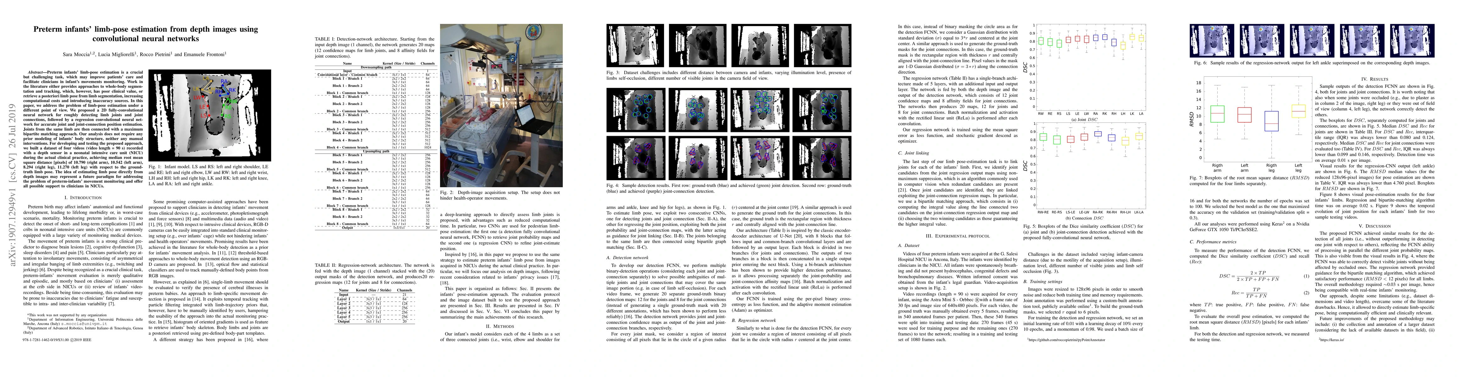 Preterm infants' limb-pose estimation is a crucial but challenging task, which may improve patients' care and facilitate clinicians in infant's movements monitoring. Work in the literature either provides approaches to whole-body segmentation and tracking, which, however, has poor clinical value, or retrieve a posteriori limb pose from limb segmentation, increasing computational costs and introducing inaccuracy sources. In this paper, we address the problem of limb-pose estimation under a different point of view. We proposed a 2D fully-convolutional neural network for roughly detecting limb joints and joint connections, followed by a regression convolutional neural network for accurate joint and joint-connection position estimation. Joints from the same limb are then connected with a maximum bipartite matching approach. Our analysis does not require any prior modeling of infants' body structure, neither any manual interventions. For developing and testing the proposed approach, we built a dataset of four videos (video length = 90 s) recorded with a depth sensor in a neonatal intensive care unit (NICU) during the actual clinical practice, achieving median root mean square distance [pixels] of 10.790 (right arm), 10.542 (left arm), 8.294 (right leg), 11.270 (left leg) with respect to the ground-truth limb pose. The idea of estimating limb pose directly from depth images may represent a future paradigm for addressing the problem of preterm-infants' movement monitoring and offer all possible support to clinicians in NICUs.