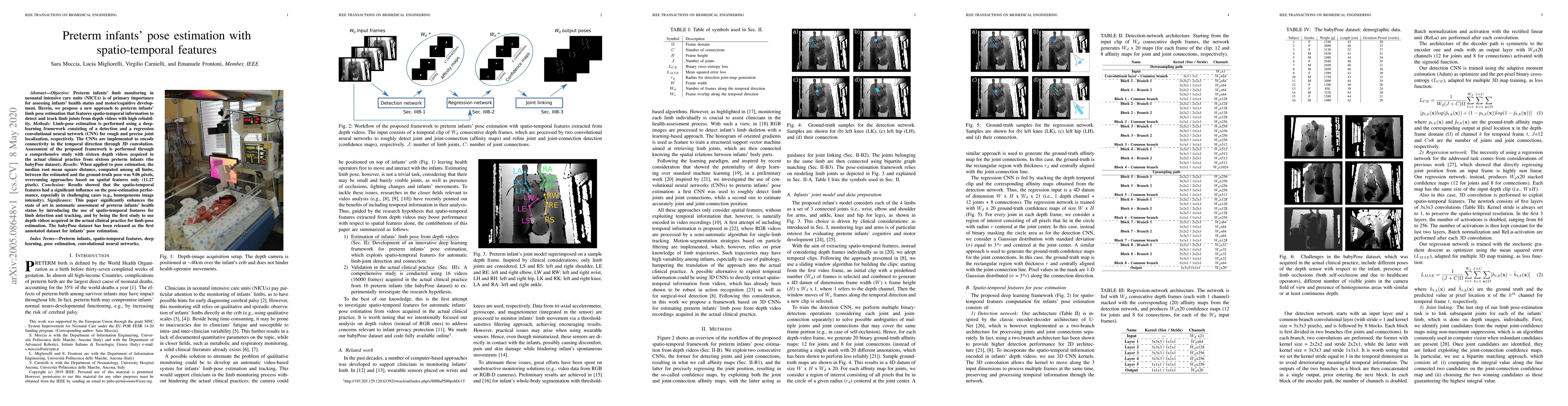 Objective: Preterm infants' limb monitoring in neonatal intensive care units (NICUs) is of primary importance for assessing infants' health status and motor/cognitive development. Herein, we propose a new approach to preterm infants' limb pose estimation that features spatio-temporal information to detect and track limb joints from depth videos with high reliability. Methods: Limb-pose estimation is performed using a deep-learning framework consisting of a detection and a regression convolutional neural network (CNN) for rough and precise joint localization, respectively. The CNNs are implemented to encode connectivity in the temporal direction through 3D convolution. Assessment of the proposed framework is performed through a comprehensive study with sixteen depth videos acquired in the actual clinical practice from sixteen preterm infants (the babyPose dataset). Results: When applied to pose estimation, the median root mean squared distance, computed among all limbs, between the estimated and the ground-truth pose was 9.06 pixels, overcoming approaches based on spatial features only (11.27pixels). Conclusion: Results showed that the spatio-temporal features had a significant influence on the pose-estimation performance, especially in challenging cases (e.g., homogeneous image intensity). Significance: This paper significantly enhances the state of art in automatic assessment of preterm infants' health status by introducing the use of spatio-temporal features for limb detection and tracking, and by being the first study to use depth videos acquired in the actual clinical practice for limb-pose estimation. The babyPose dataset has been released as the first annotated dataset for infants' pose estimation.