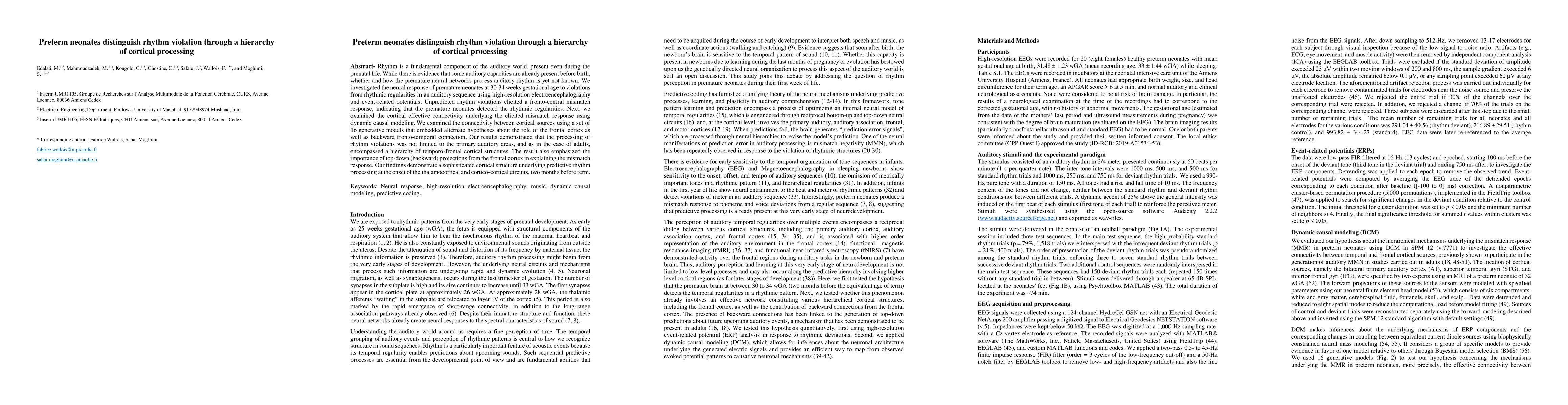 Premature neonates at 30-34 weeks gestational age detect rhythm violations through a fronto-central mismatch response, indicating a hierarchy of cortical processing involving temporo-frontal structures, with top-down projections from the frontal cortex playing a crucial role.