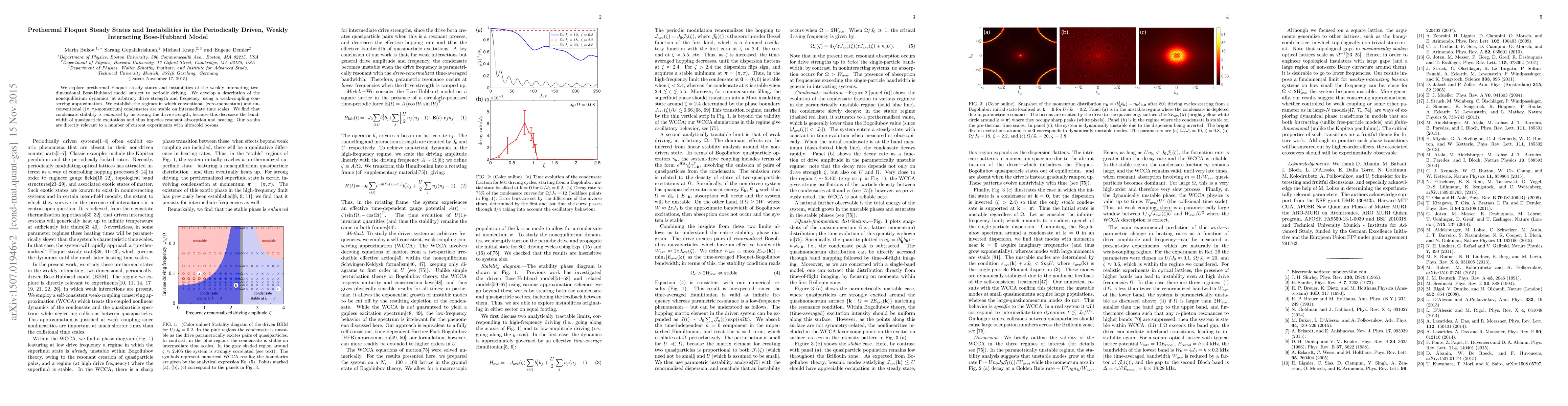 We explore prethermal Floquet steady states and instabilities of the weakly interacting two-dimensional Bose-Hubbard model subject to periodic driving. We develop a description of the nonequilibrium dynamics, at arbitrary drive strength and frequency, using a weak-coupling conserving approximation. We establish the regimes in which conventional (zero-momentum) and unconventional [$(\pi,\pi)$-momentum] condensates are stable on intermediate time scales. We find that condensate stability is \emph{enhanced} by increasing the drive strength, because this decreases the bandwidth of quasiparticle excitations and thus impedes resonant absorption and heating. Our results are directly relevant to a number of current experiments with ultracold bosons.