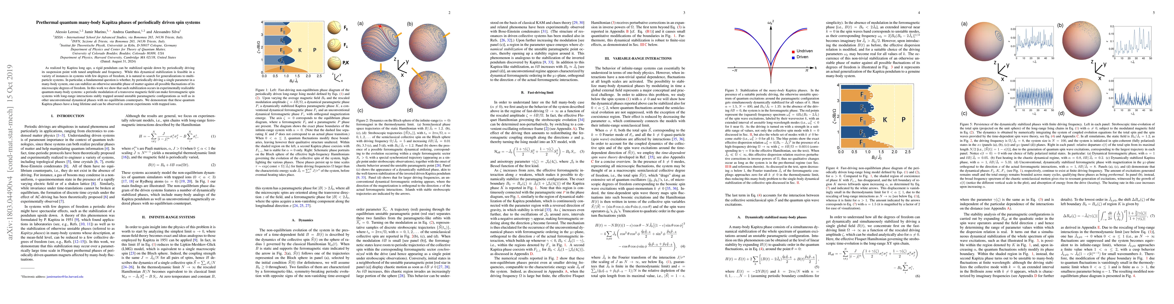 This paper explores the stabilization of unstable phases in quantum many-body systems through periodic driving, akin to Kapitza's pendulum. It demonstrates that periodic modulation of a magnetic field can trap ferromagnetic spin systems in unconventional dynamical phases, showing long-lived prethermal quantum Kapitza phases observable in trapped ion experiments.