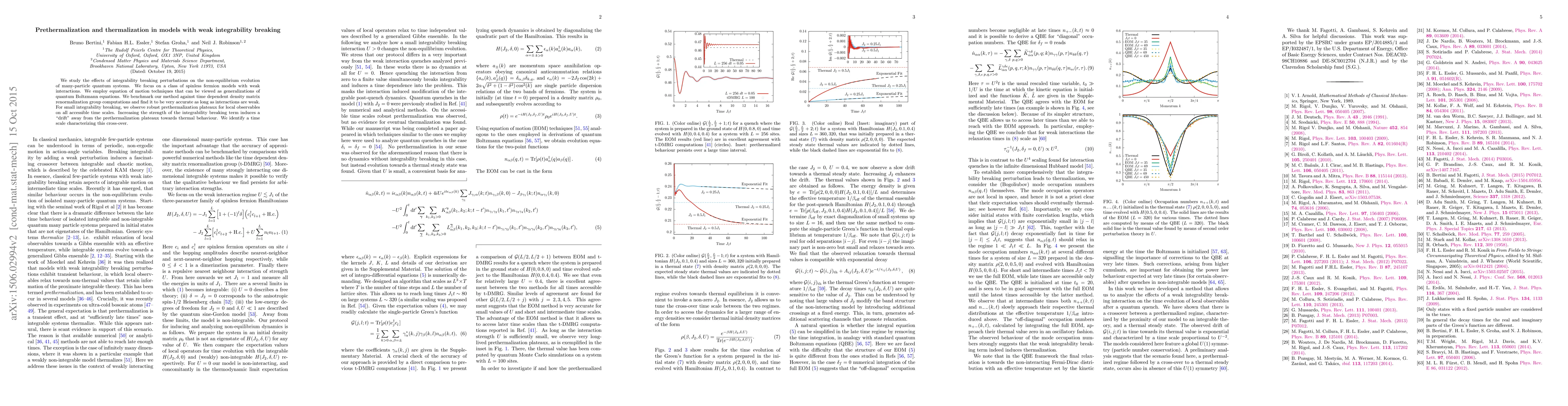 We study the effects of integrability breaking perturbations on the non-equilibrium evolution of many-particle quantum systems. We focus on a class of spinless fermion models with weak interactions. We employ equation of motion techniques that can be viewed as generalizations of quantum Boltzmann equations. We benchmark our method against time dependent density matrix renormalization group computations and find it to be very accurate as long as interactions are weak. For small integrability breaking, we observe robust prethermalization plateaux for local observables on all accessible time scales. Increasing the strength of the integrability breaking term induces a "drift" away from the prethermalization plateaux towards thermal behaviour. We identify a time scale characterizing this cross-over.