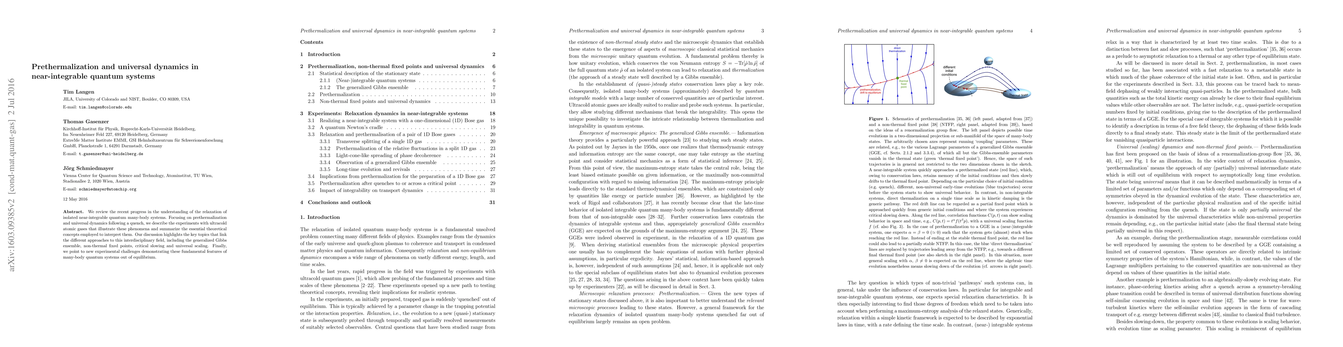 The research reviews progress in understanding the relaxation of isolated near-integrable quantum many-body systems, focusing on prethermalization and universal dynamics following a quench, with experimental illustrations using ultracold atomic gases and theoretical concepts to interpret them.