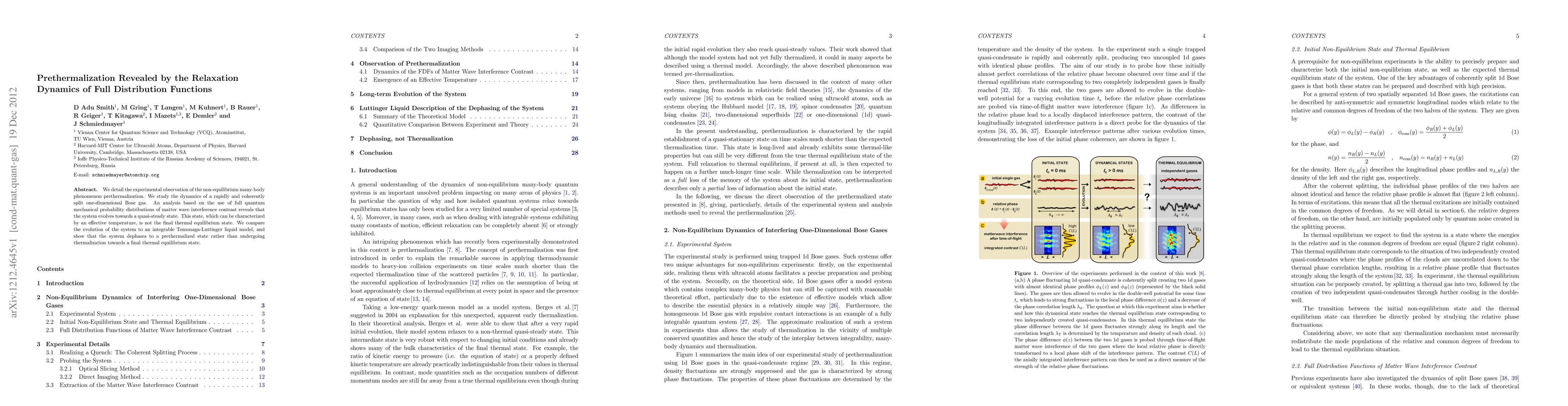 We detail the experimental observation of the non-equilibrium many-body phenomenon prethermalization. We study the dynamics of a rapidly and coherently split one-dimensional Bose gas. An analysis based on the use of full quantum mechanical probability distributions of matter wave interference contrast reveals that the system evolves towards a quasi-steady state. This state, which can be characterized by an effective temperature, is not the final thermal equilibrium state. We compare the evolution of the system to an integrable Tomonaga-Luttinger liquid model and show that the system dephases to a prethermalized state rather than undergoing thermalization towards a final thermal equilibrium state.