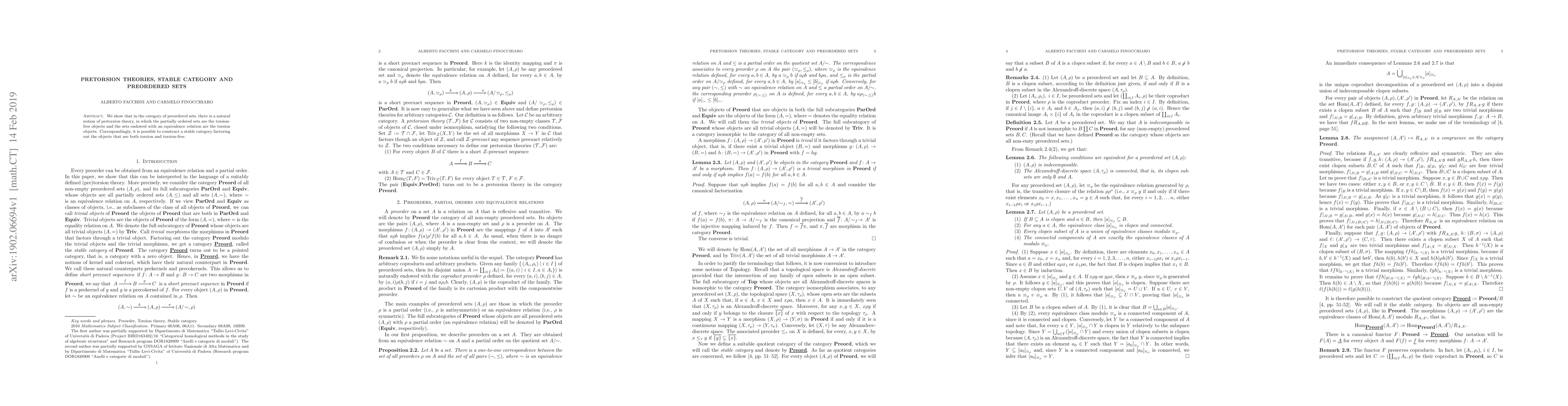 This paper introduces a pretorsion theory in the category of preordered sets, where torsion-free objects are partially ordered sets and torsion objects are sets with equivalence relations. It also constructs a stable category by factoring out both torsion and torsion-free objects.