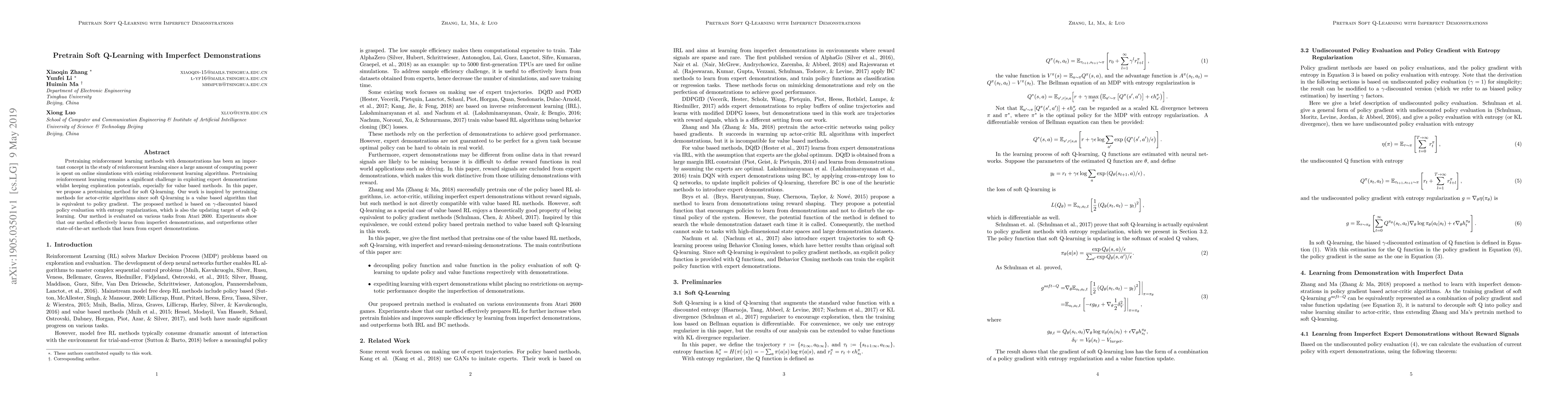 This paper proposes a pretraining method for soft Q-learning using imperfect demonstrations, inspired by actor-critic algorithms. The method employs $\gamma$-discounted biased policy evaluation with entropy regularization, and is shown to outperform other state-of-the-art methods on Atari 2600 tasks.