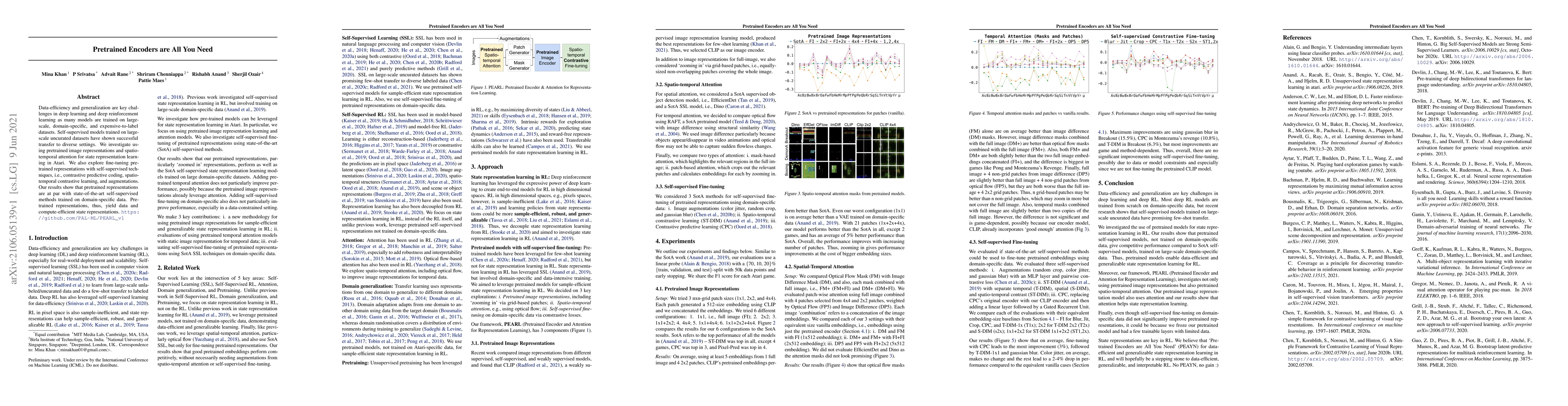 Data-efficiency and generalization are key challenges in deep learning and deep reinforcement learning as many models are trained on large-scale, domain-specific, and expensive-to-label datasets. Self-supervised models trained on large-scale uncurated datasets have shown successful transfer to diverse settings. We investigate using pretrained image representations and spatio-temporal attention for state representation learning in Atari. We also explore fine-tuning pretrained representations with self-supervised techniques, i.e., contrastive predictive coding, spatio-temporal contrastive learning, and augmentations. Our results show that pretrained representations are at par with state-of-the-art self-supervised methods trained on domain-specific data. Pretrained representations, thus, yield data and compute-efficient state representations. https://github.com/PAL-ML/PEARL_v1