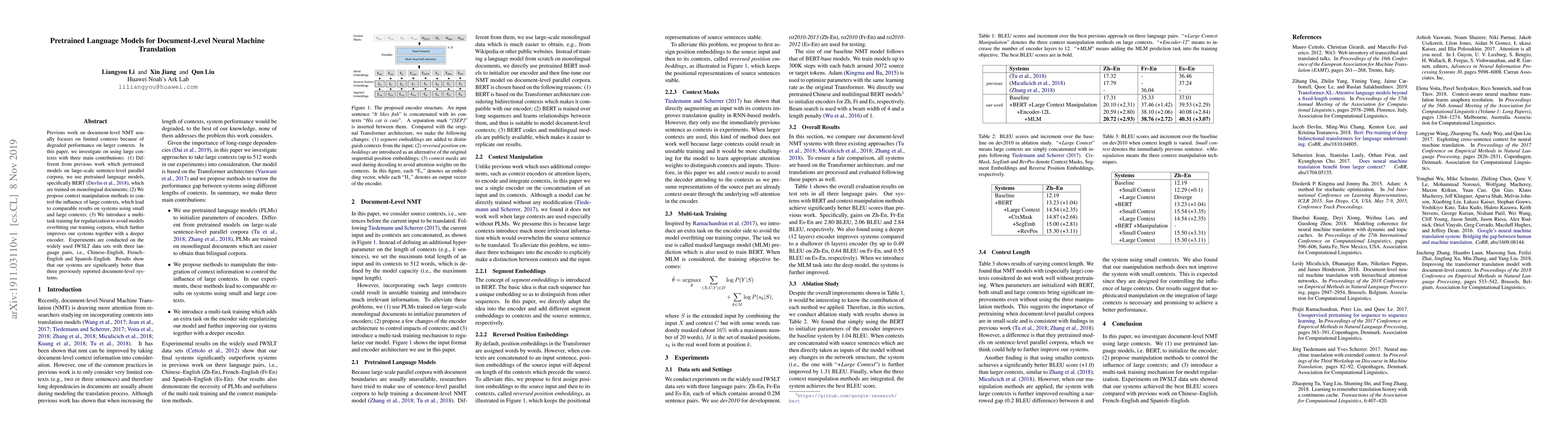 This paper explores the use of BERT pretrained on monolingual documents for document-level neural machine translation, proposing context manipulation methods and multi-task training to handle large contexts and avoid overfitting, achieving superior results on IWSLT datasets compared to previous systems.