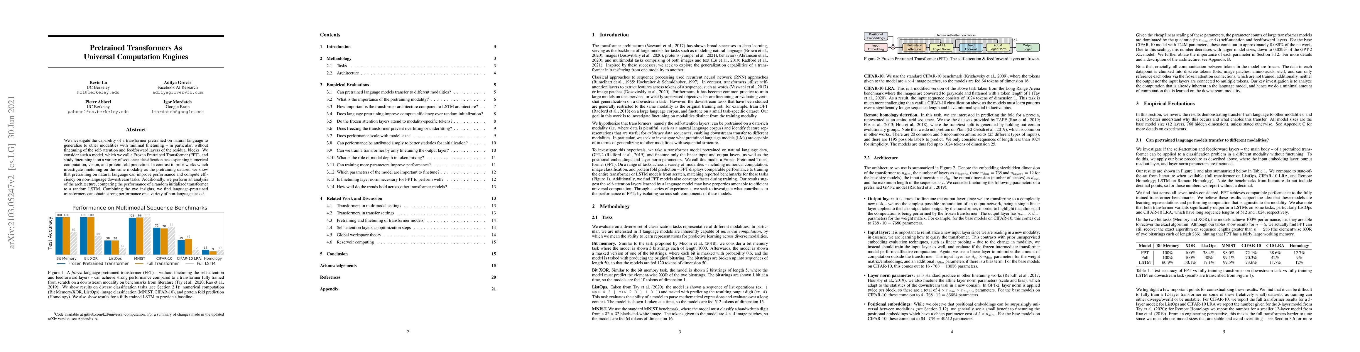 We investigate the capability of a transformer pretrained on natural language to generalize to other modalities with minimal finetuning -- in particular, without finetuning of the self-attention and feedforward layers of the residual blocks. We consider such a model, which we call a Frozen Pretrained Transformer (FPT), and study finetuning it on a variety of sequence classification tasks spanning numerical computation, vision, and protein fold prediction. In contrast to prior works which investigate finetuning on the same modality as the pretraining dataset, we show that pretraining on natural language can improve performance and compute efficiency on non-language downstream tasks. Additionally, we perform an analysis of the architecture, comparing the performance of a random initialized transformer to a random LSTM. Combining the two insights, we find language-pretrained transformers can obtain strong performance on a variety of non-language tasks.