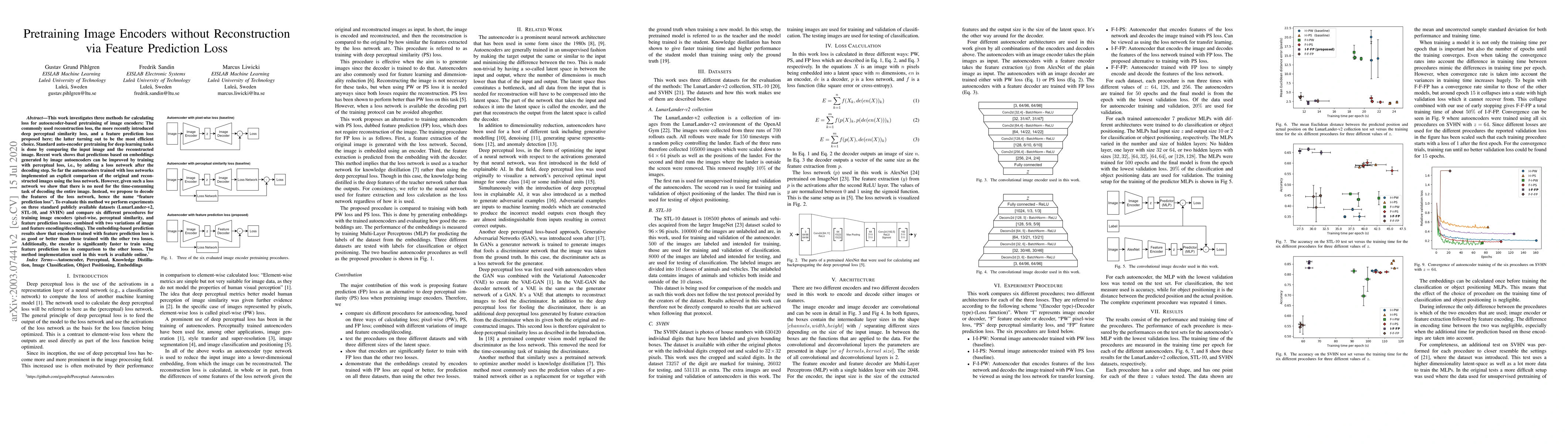 This work investigates three methods for calculating loss for autoencoder-based pretraining of image encoders: The commonly used reconstruction loss, the more recently introduced deep perceptual similarity loss, and a feature prediction loss proposed here; the latter turning out to be the most efficient choice. Standard auto-encoder pretraining for deep learning tasks is done by comparing the input image and the reconstructed image. Recent work shows that predictions based on embeddings generated by image autoencoders can be improved by training with perceptual loss, i.e., by adding a loss network after the decoding step. So far the autoencoders trained with loss networks implemented an explicit comparison of the original and reconstructed images using the loss network. However, given such a loss network we show that there is no need for the time-consuming task of decoding the entire image. Instead, we propose to decode the features of the loss network, hence the name "feature prediction loss". To evaluate this method we perform experiments on three standard publicly available datasets (LunarLander-v2, STL-10, and SVHN) and compare six different procedures for training image encoders (pixel-wise, perceptual similarity, and feature prediction losses; combined with two variations of image and feature encoding/decoding). The embedding-based prediction results show that encoders trained with feature prediction loss is as good or better than those trained with the other two losses. Additionally, the encoder is significantly faster to train using feature prediction loss in comparison to the other losses. The method implementation used in this work is available online: https://github.com/guspih/Perceptual-Autoencoders