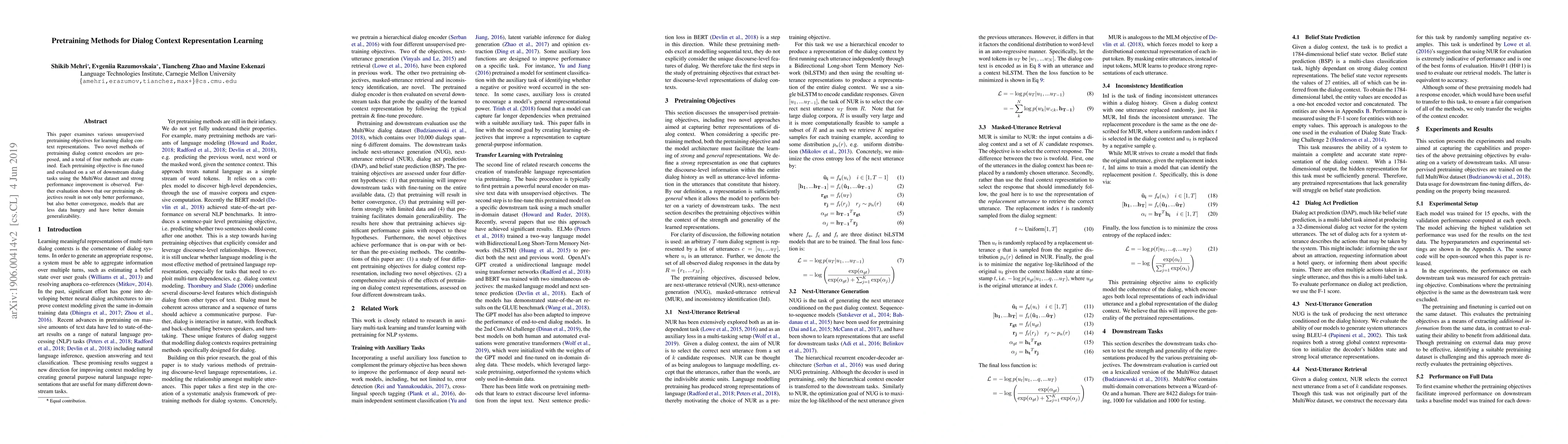 This paper investigates multiple unsupervised pretraining methods for dialog context representation learning, proposing two novel techniques alongside two existing methods. The results show significant improvements in performance, convergence, and domain generalizability across various dialog tasks using the MultiWoz dataset.