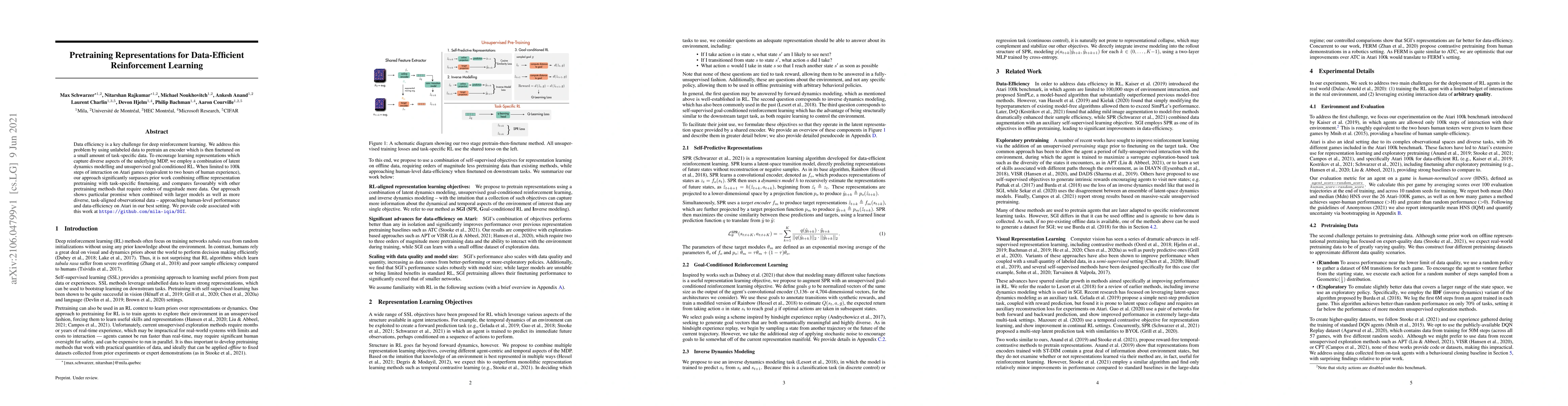 Data efficiency is a key challenge for deep reinforcement learning. We address this problem by using unlabeled data to pretrain an encoder which is then finetuned on a small amount of task-specific data. To encourage learning representations which capture diverse aspects of the underlying MDP, we employ a combination of latent dynamics modelling and unsupervised goal-conditioned RL. When limited to 100k steps of interaction on Atari games (equivalent to two hours of human experience), our approach significantly surpasses prior work combining offline representation pretraining with task-specific finetuning, and compares favourably with other pretraining methods that require orders of magnitude more data. Our approach shows particular promise when combined with larger models as well as more diverse, task-aligned observational data -- approaching human-level performance and data-efficiency on Atari in our best setting. We provide code associated with this work at https://github.com/mila-iqia/SGI.