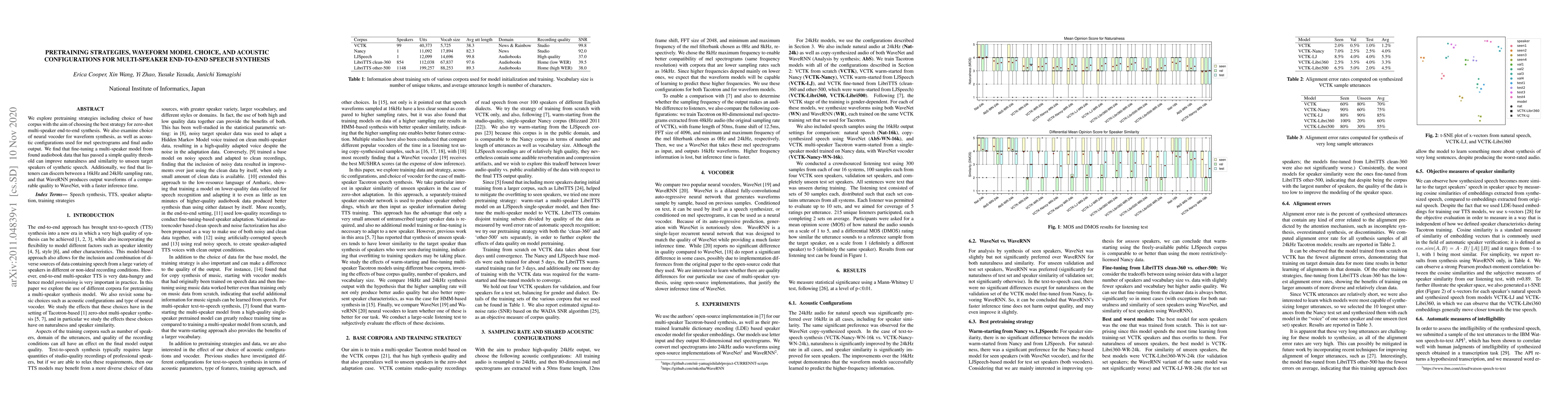 This paper investigates optimal pretraining strategies for multi-speaker end-to-end speech synthesis, focusing on base corpus selection and neural vocoder choice. It finds that fine-tuning from high-quality audiobook data enhances synthetic speech quality, and WaveRNN offers comparable quality to WaveNet with faster inference.