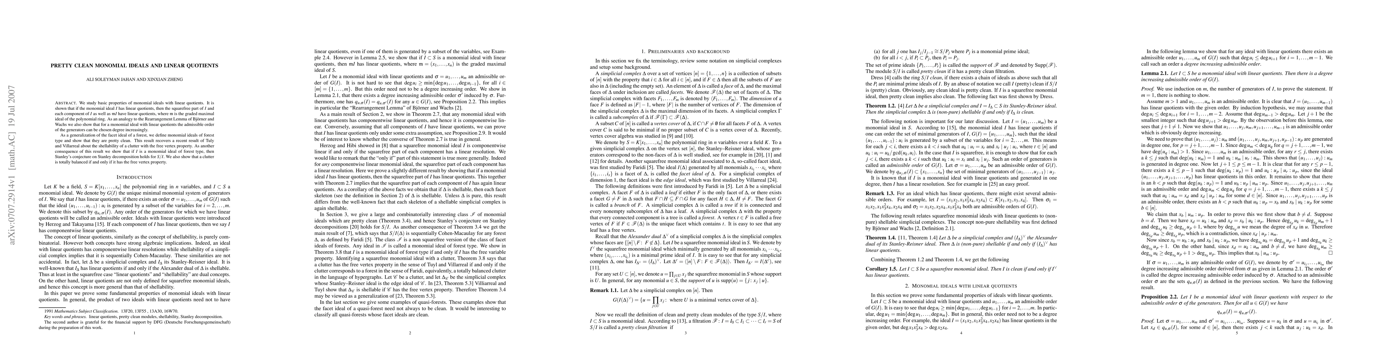 The paper studies properties of monomial ideals with linear quotients, proving several results related to their structure and decomposition.