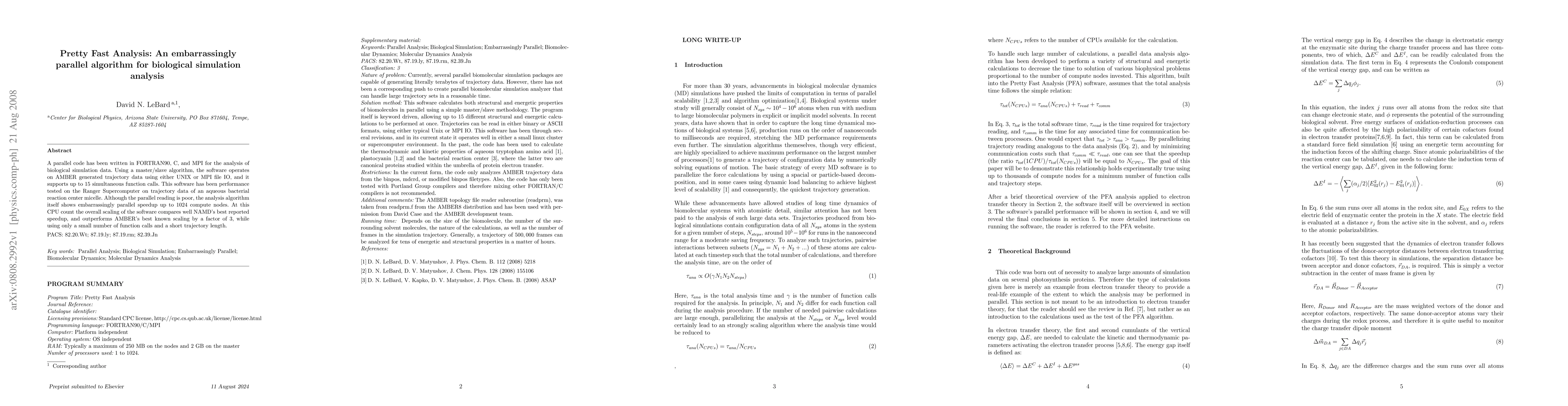 This paper presents a parallel algorithm in FORTRAN90, C, and MPI for analyzing biological simulation data, achieving significant speedup up to 1024 compute nodes on the Ranger Supercomputer, outperforming AMBER's best scaling by a factor of 3. Despite parallel reading inefficiencies, the analysis algorithm itself demonstrates excellent performance.