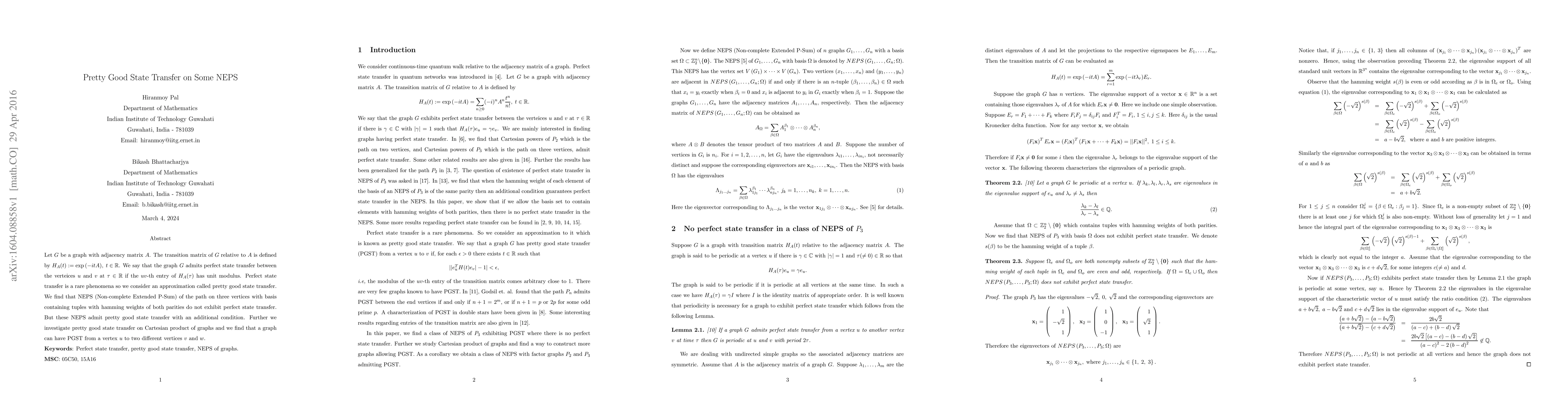 This paper explores the concept of pretty good state transfer (PGST) in graphs, showing that certain NEPS of paths do not achieve perfect state transfer but can exhibit PGST under specific conditions. It also investigates PGST on Cartesian products of graphs, revealing that a single vertex can have PGST to two distinct vertices.
