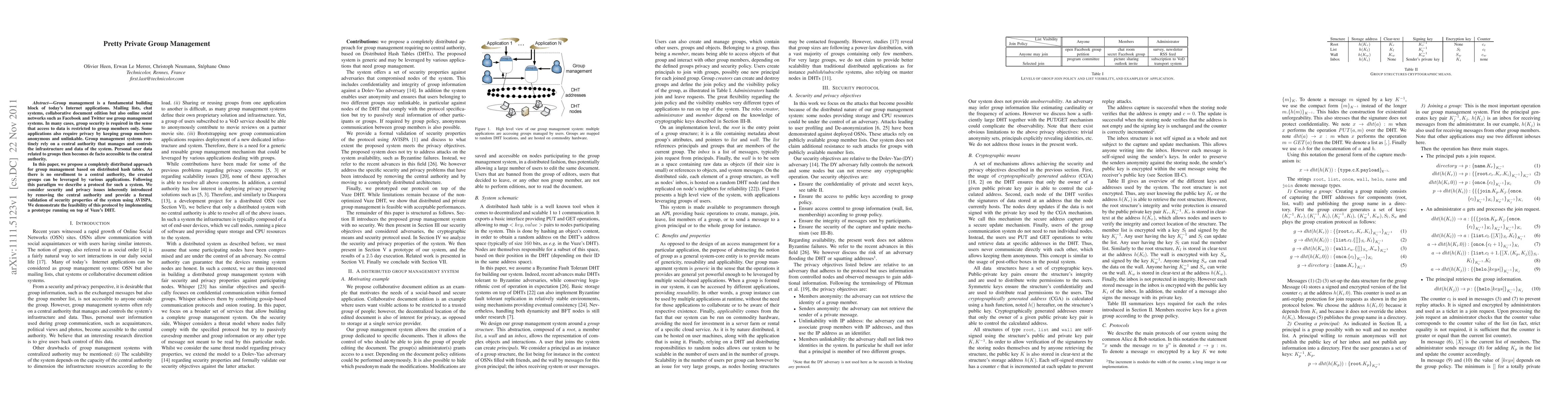 Group management is a fundamental building block of today's Internet applications. Mailing lists, chat systems, collaborative document edition but also online social networks such as Facebook and Twitter use group management systems. In many cases, group security is required in the sense that access to data is restricted to group members only. Some applications also require privacy by keeping group members anonymous and unlinkable. Group management systems routinely rely on a central authority that manages and controls the infrastructure and data of the system. Personal user data related to groups then becomes de facto accessible to the central authority. In this paper, we propose a completely distributed approach for group management based on distributed hash tables. As there is no enrollment to a central authority, the created groups can be leveraged by various applications. Following this paradigm we describe a protocol for such a system. We consider security and privacy issues inherently introduced by removing the central authority and provide a formal validation of security properties of the system using AVISPA. We demonstrate the feasibility of this protocol by implementing a prototype running on top of Vuze's DHT.