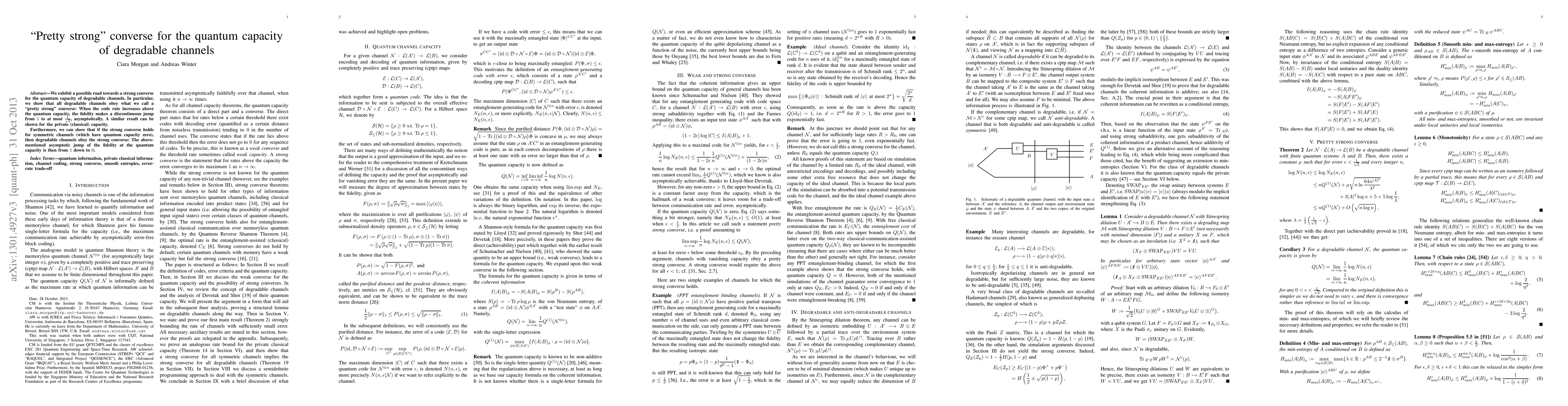 This paper demonstrates a "pretty strong" converse for the quantum capacity of degradable channels, showing that fidelity drops discontinuously from 1 to at most 0.707 when code rates exceed the quantum capacity. It also extends this result to the classical private capacity and establishes that if the strong converse holds for symmetric channels, it applies to degradable channels as well.