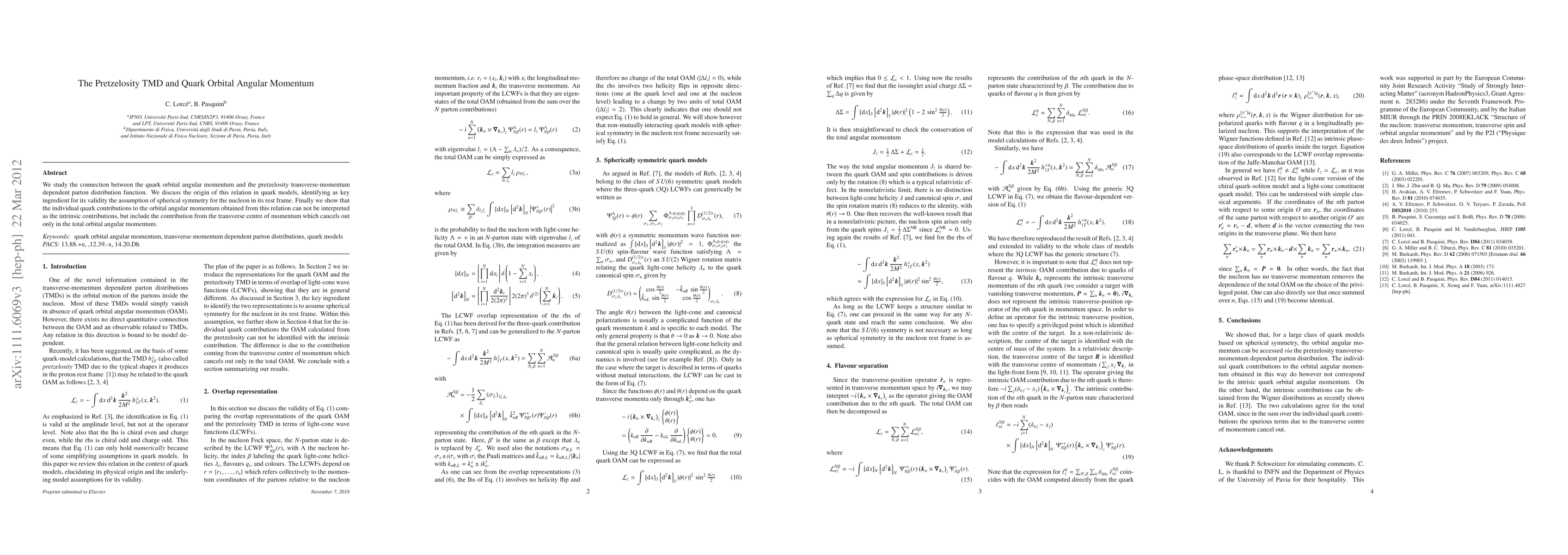 This paper investigates the relationship between quark orbital angular momentum and pretzelosity, a TMD parton distribution function, emphasizing the role of nucleon's spherical symmetry. It concludes that individual quark contributions to orbital angular momentum include non-intrinsic components from the transverse center of momentum.