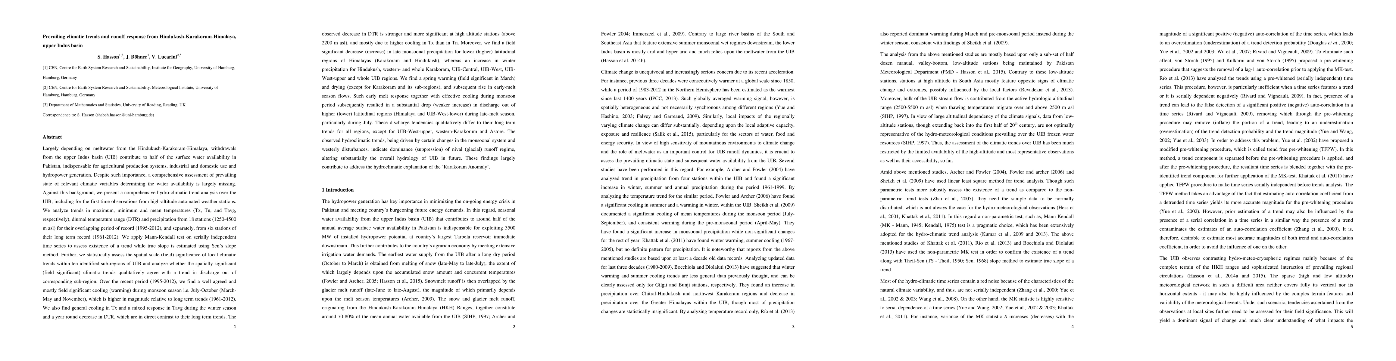 This paper analyzes climatic trends in the Hindukush-Karakoram-Himalaya region from 1995-2012, finding a significant cooling trend during monsoon seasons and warming in other periods. The study links these trends to changes in the monsoonal system and westerly disturbances, predicting a shift from nival to glacial runoff regimes impacting the hydrology of the upper Indus basin.