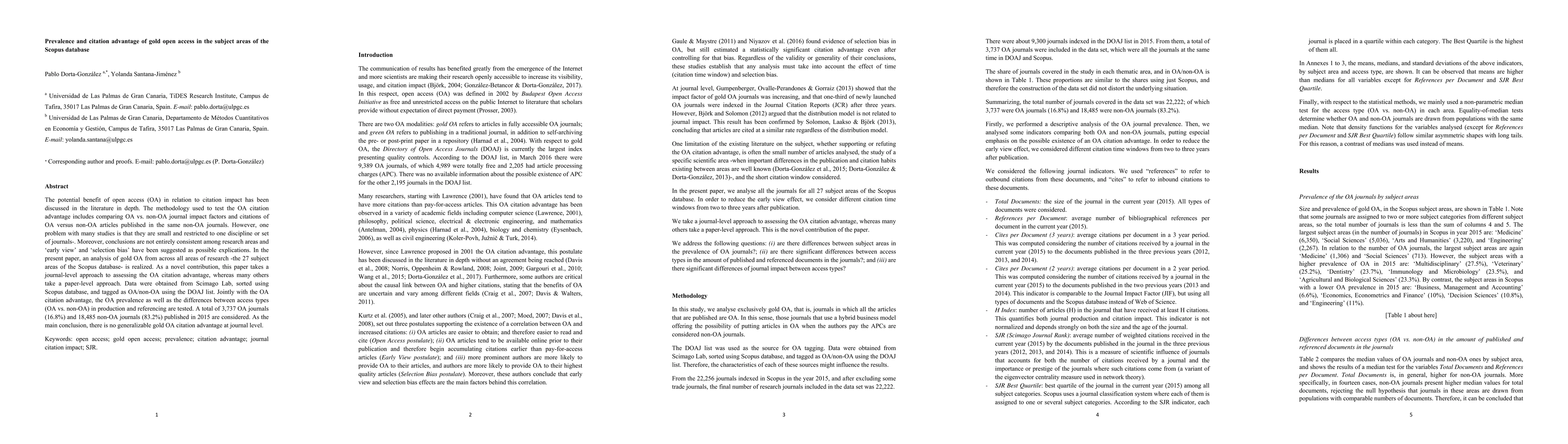 This paper analyzes the prevalence and citation advantage of gold open access (OA) across all 27 subject areas in the Scopus database. It finds no generalizable gold OA citation advantage at the journal level, contrasting with many smaller-scale studies, and highlights differences in production and referencing between OA and non-OA journals.
