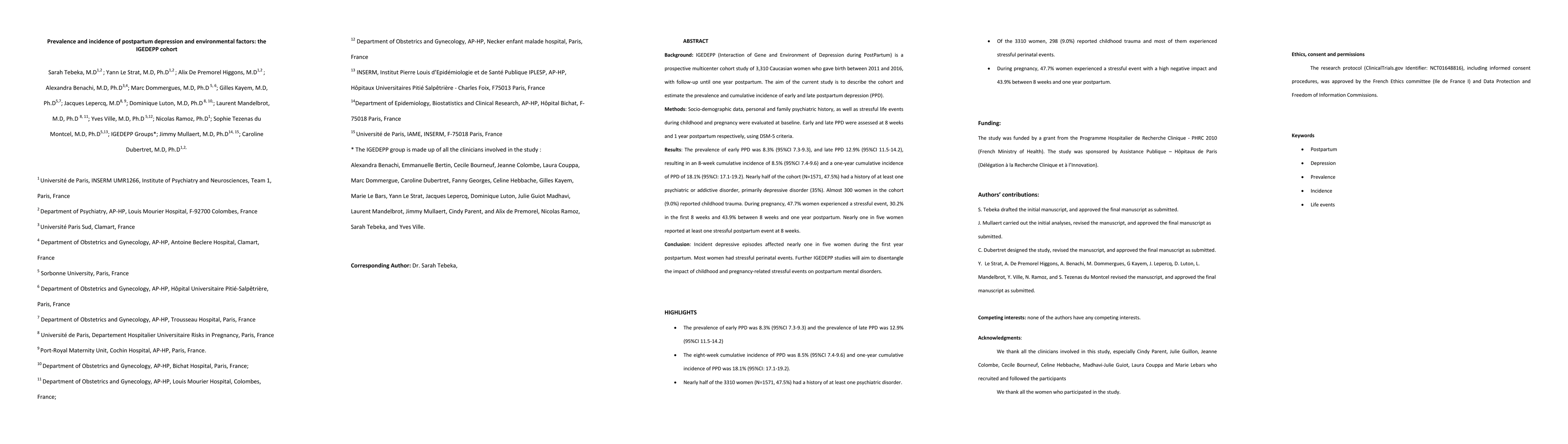Background: IGEDEPP (Interaction of Gene and Environment of Depression during PostPartum) is a prospective multicenter cohort study of 3,310 Caucasian women who gave birth between 2011 and 2016, with follow-up until one year postpartum. The aim of the current study is to describe the cohort and estimate the prevalence and cumulative incidence of early and late postpartum depression (PPD). Methods: Socio-demographic data, personal and family psychiatric history, as well as stressful life events during childhood and pregnancy were evaluated at baseline. Early and late PPD were assessed at 8 weeks and 1 year postpartum respectively, using DSM-5 criteria. Results: The prevalence of early PPD was 8.3% (95%CI 7.3-9.3), and late PPD 12.9% (95%CI 11.5-14.2), resulting in an 8-week cumulative incidence of 8.5% (95%CI 7.4-9.6) and a one-year cumulative incidence of PPD of 18.1% (95%CI: 17.1-19.2). Nearly half of the cohort (N=1571, 47.5%) had a history of at least one psychiatric or addictive disorder, primarily depressive disorder (35%). Almost 300 women in the cohort (9.0%) reported childhood trauma. During pregnancy, 47.7% women experienced a stressful event, 30.2% in the first 8 weeks and 43.9% between 8 weeks and one year postpartum. Nearly one in five women reported at least one stressful postpartum event at 8 weeks. Conclusion: Incident depressive episodes affected nearly one in five women during the first year postpartum. Most women had stressful perinatal events. Further IGEDEPP studies will aim to disentangle the impact of childhood and pregnancy-related stressful events on postpartum mental disorders.