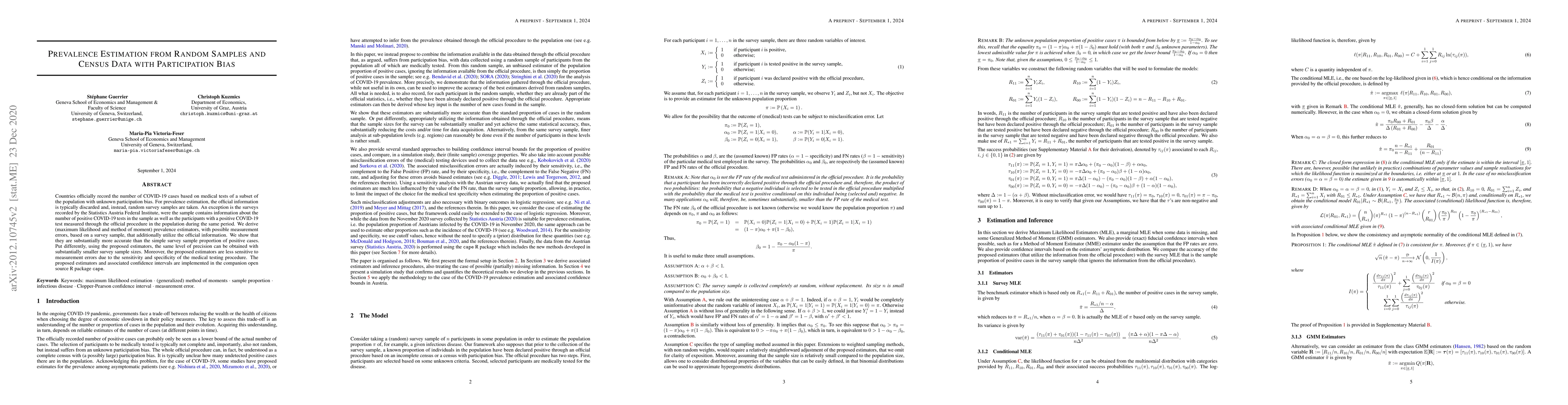 Countries officially record the number of COVID-19 cases based on medical tests of a subset of the population with unknown participation bias. For prevalence estimation, the official information is typically discarded and, instead, small random survey samples are taken. We derive (maximum likelihood and method of moment) prevalence estimators, based on a survey sample, that additionally utilize the official information, and that are substantially more accurate than the simple sample proportion of positive cases. Put differently, using our estimators, the same level of precision can be obtained with substantially smaller survey samples. We take into account the possibility of measurement errors due to the sensitivity and specificity of the medical testing procedure. The proposed estimators and associated confidence intervals are implemented in the companion open source R package cape.