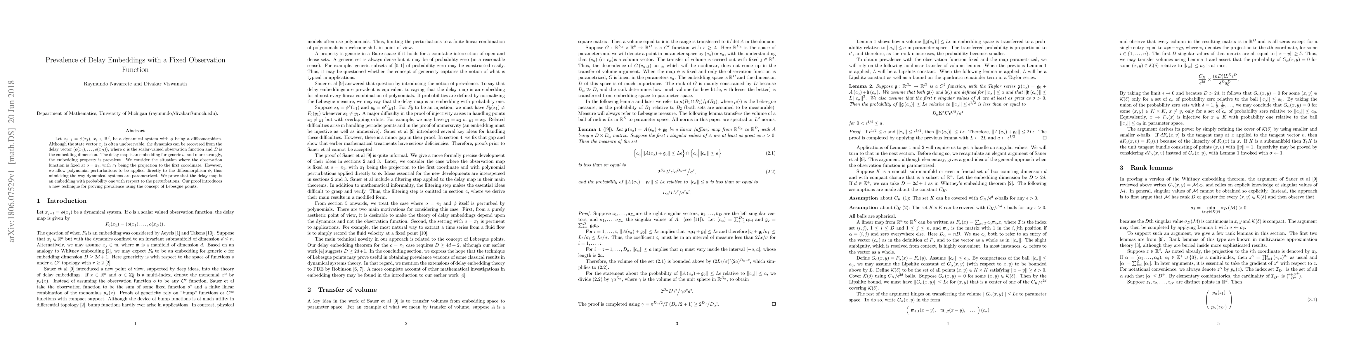 Researchers proved that delay embeddings with a fixed observation function can recover dynamical systems' dynamics, even when the system is parametrized with polynomial perturbations. The study introduces a new technique for proving prevalence using Lebesgue points.