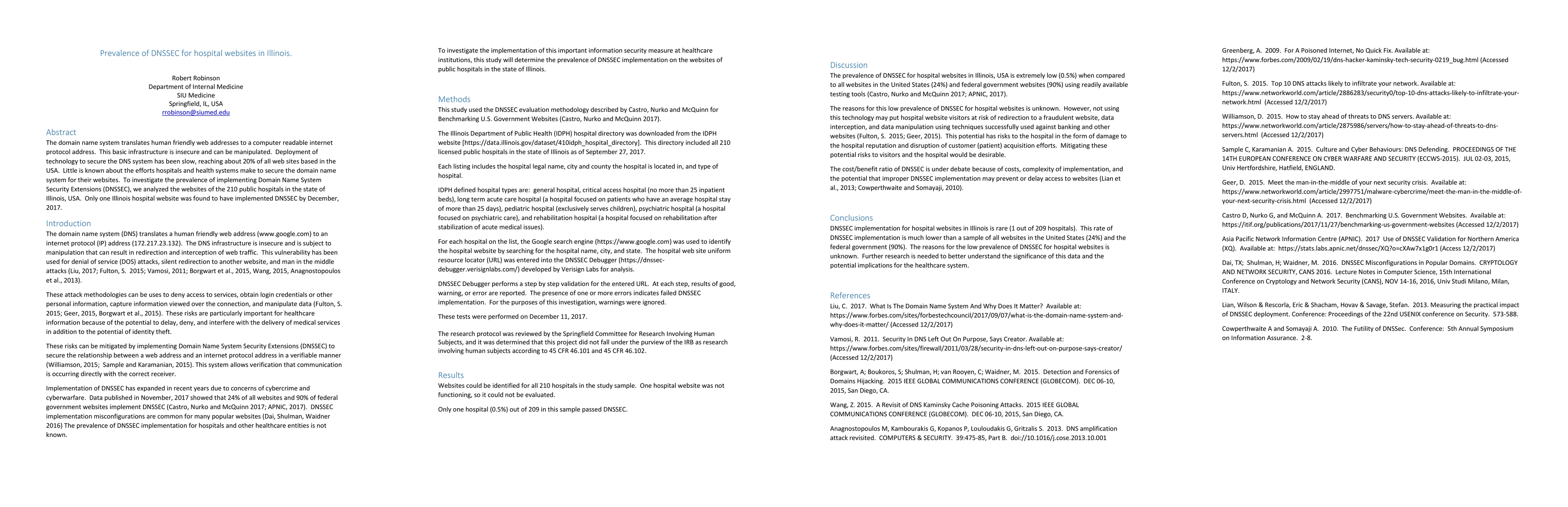Summary: This study examines the adoption of DNSSEC among public hospital websites in Illinois, finding that only one out of 210 hospitals had implemented this security technology by December 2017, indicating minimal widespread use in the healthcare sector.