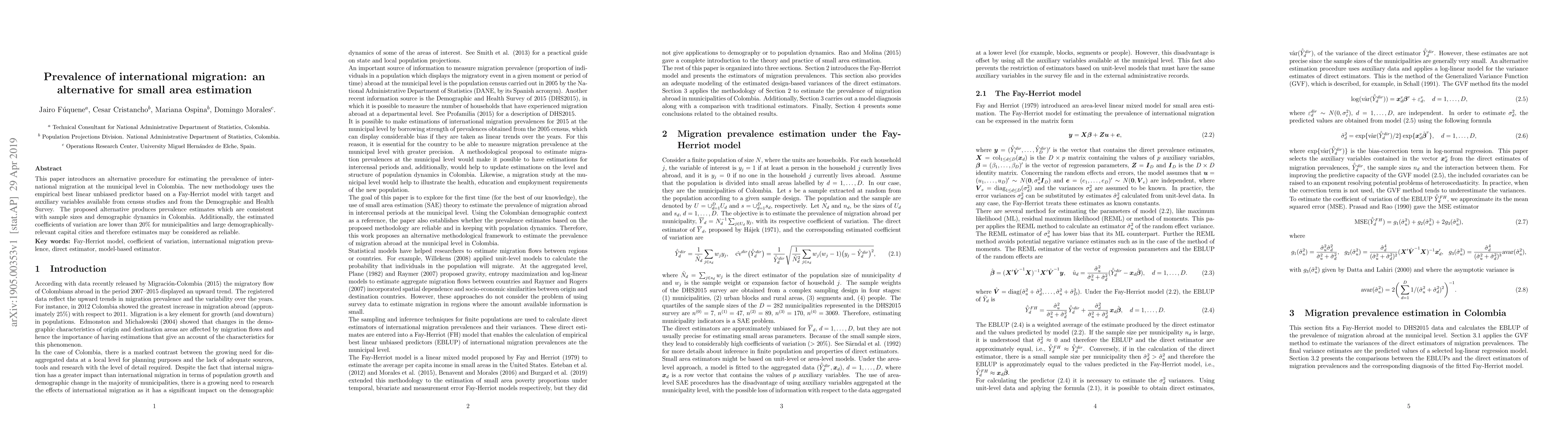 This paper introduces an alternative procedure for estimating the prevalence of international migration at the municipal level in Colombia. The new methodology uses the empirical best linear unbiased predictor based on a Fay-Herriot model with target and auxiliary variables available from census studies and from the Demographic and Health Survey. The proposed alternative produces prevalence estimates which are consistent with sample sizes and demographic dynamics in Colombia. Additionally, the estimated coefficients of variation are lower than 20% for municipalities and large demographically-relevant capital cities and therefore estimates may be considered as reliable.