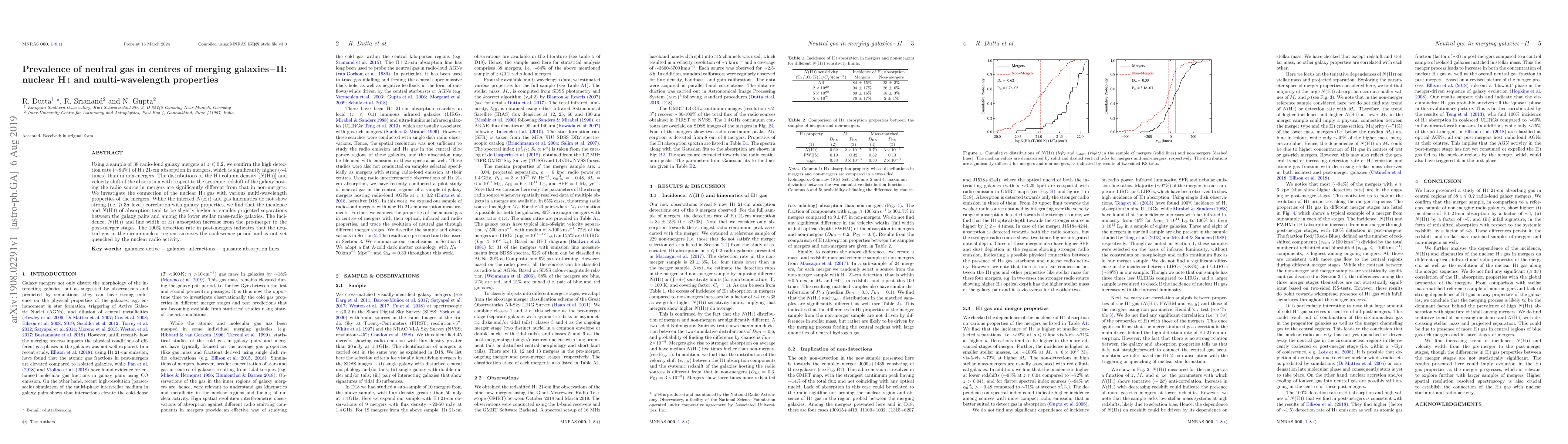 This study confirms a high (~84%) detection rate of HI 21-cm absorption in merging galaxies, significantly higher than in non-mergers. The nuclear HI gas shows distinct distributions in column density and velocity shift, and while it correlates weakly with galaxy properties, it persists in the circumnuclear regions even after galaxy merger coalescence.