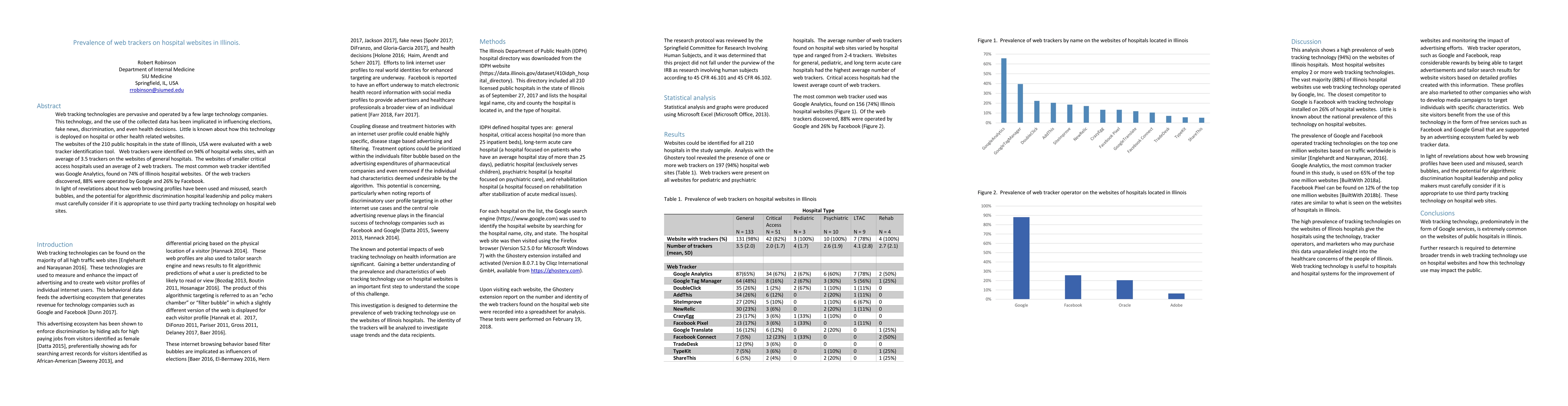 This study found that 94% of Illinois hospital websites use web trackers, with an average of 3.5 trackers on general hospital sites and 2 on smaller critical access hospitals. Google Analytics was the most prevalent tracker, used by 74% of hospitals, with 88% of trackers operated by Google and 26% by Facebook.
