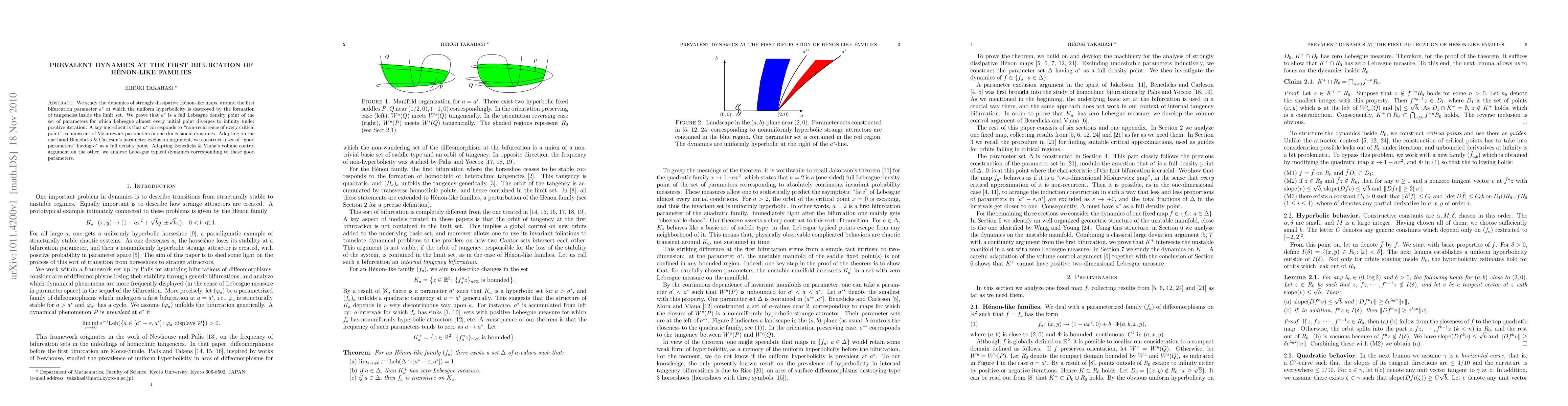 We study the dynamics of strongly dissipative H\'enon-like maps, around the first bifurcation parameter $a^*$ at which the uniform hyperbolicity is destroyed by the formation of tangencies inside the limit set. We prove that $a^*$ is a full Lebesgue density point of the set of parameters for which Lebesgue almost every initial point diverges to infinity under positive iteration. A key ingredient is that $a^*$ corresponds to "non-recurrence of every critical point", reminiscent of Misiurewicz parameters in one-dimensional dynamics. Adapting on the one hand Benedicks & Carleson's parameter exclusion argument, we construct a set of "good parameters" having $a^*$ as a full density point. Adapting Benedicks & Viana's volume control argument on the other, we analyze Lebesgue typical dynamics corresponding to these good parameters.