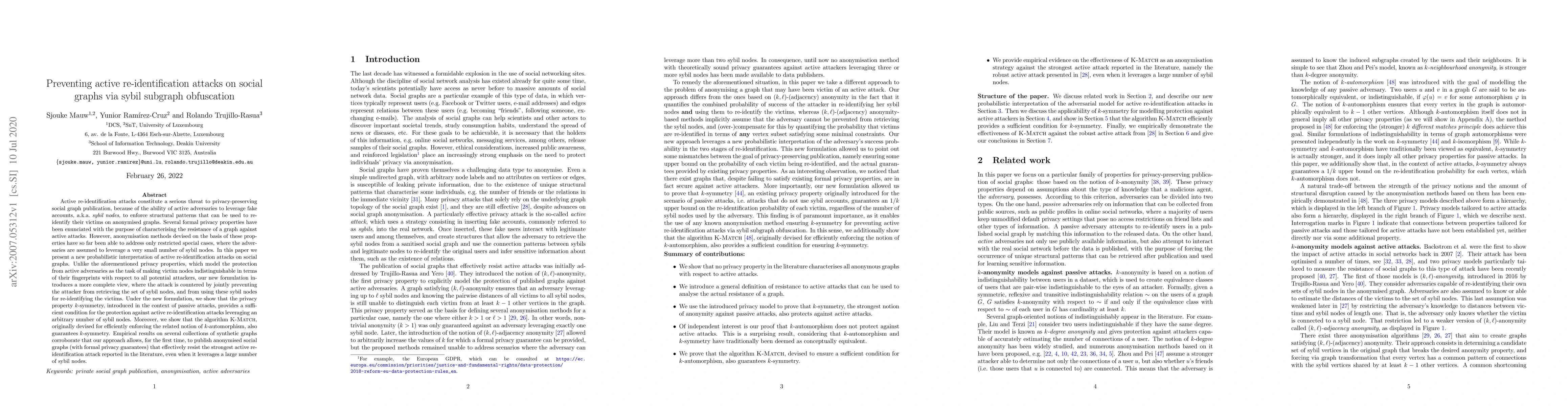 This paper addresses active re-identification attacks in the context of privacy-preserving social graph publication. Active attacks are those where the adversary can leverage fake accounts, a.k.a. sybil nodes, to enforce structural patterns that can be used to re-identify their victims on anonymised graphs. In this paper we present a new probabilistic interpretation of this type of attacks. Unlike previous privacy properties, which model the protection from active adversaries as the task of making victim nodes indistinguishable in terms of their fingerprints with respect to all potential attackers, our new formulation introduces a more complete view, where the attack is countered by jointly preventing the attacker from retrieving the set of sybil nodes, and from using these sybil nodes for re-identifying the victims. Under the new formulation, we show that the privacy property $k$-symmetry, introduced in the context of passive attacks, provides a sufficient condition for the protection against active re-identification attacks leveraging an arbitrary number of sybil nodes. Moreover, we show that the algorithm K-Match, originally devised for efficiently enforcing the related notion of $k$-automorphism, also guarantees $k$-symmetry. Empirical results on several collections of synthetic graphs corroborate that our approach allows, for the first time, to publish anonymised social graphs (with formal privacy guarantees) that effectively resist the strongest active re-identification attack reported in the literature, even when it leverages a large number of sybil nodes.