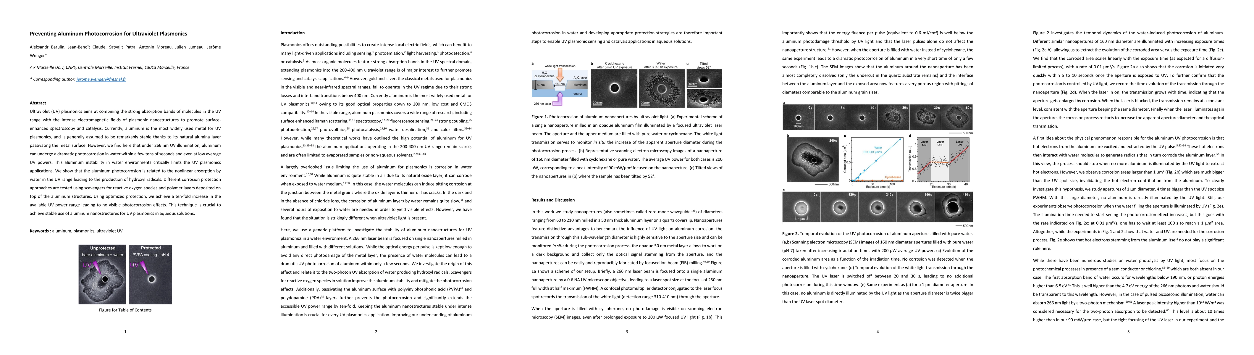This paper investigates the photocorrosion of aluminum under UV illumination, revealing its instability in water environments that limits UV plasmonics. The authors propose and optimize corrosion protection methods, achieving a ten-fold increase in usable UV power without visible photocorrosion, essential for stable aluminum nanostructures in UV applications.