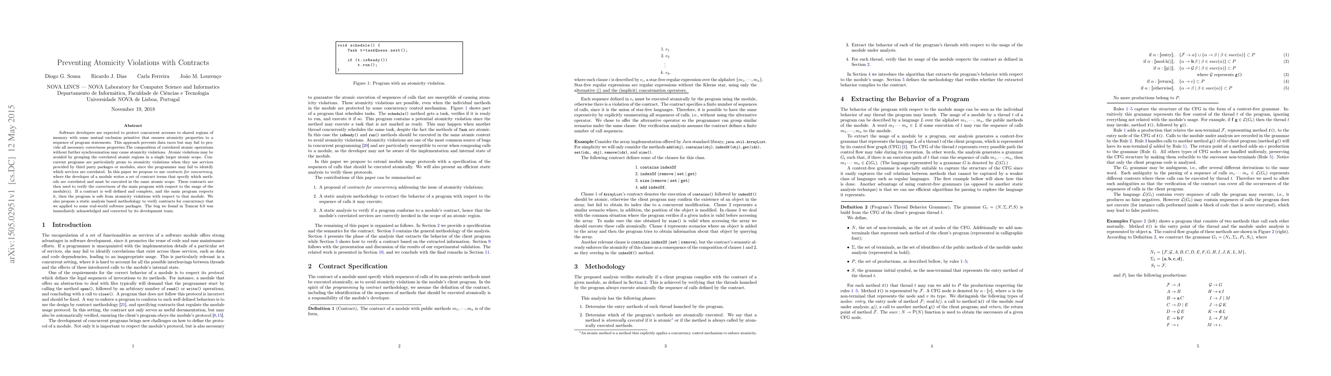 This paper proposes using contracts to prevent atomicity violations in concurrent programs by specifying correlated atomic operations in module contracts. A static analysis method verifies these contracts to ensure the main program respects them, thereby avoiding atomicity violations, as demonstrated by correcting a bug in Tomcat 6.0.