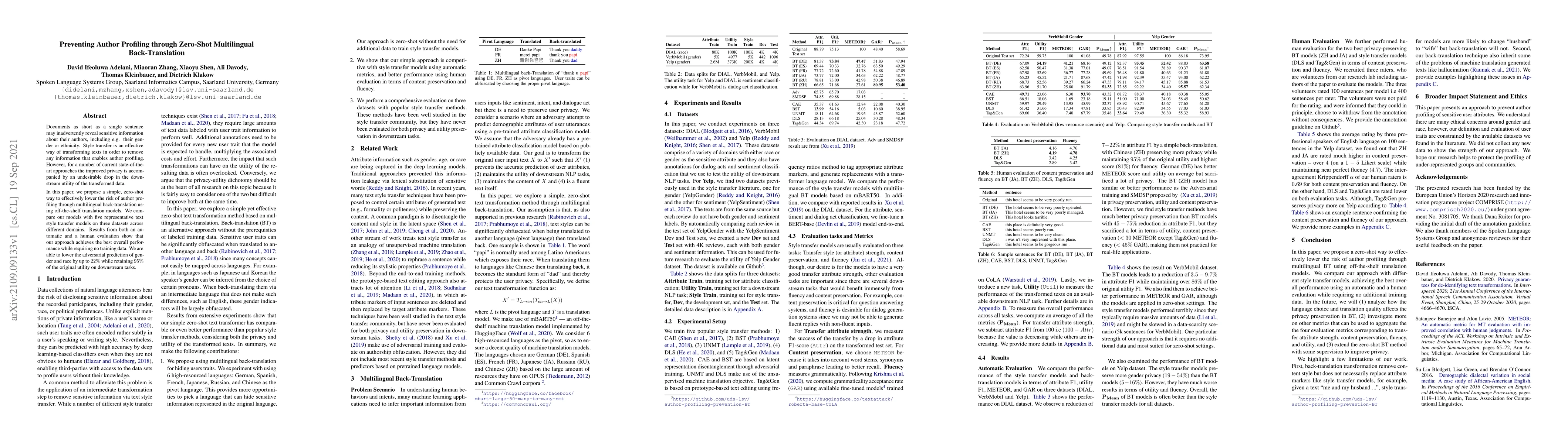 This paper proposes a zero-shot multilingual back-translation method to prevent author profiling without sacrificing text utility. The approach achieves up to a 22% reduction in gender and race prediction while retaining 95% of original text utility, outperforming other style transfer models.