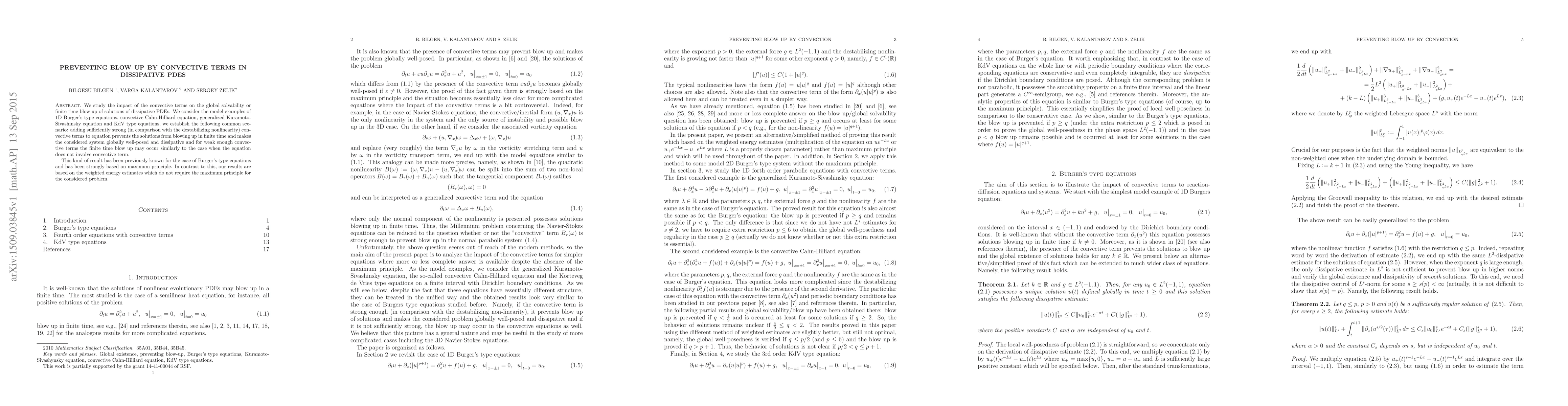 We study the impact of the convective terms on the global solvability or finite time blow up of solutions of dissipative PDEs. We consider the model examples of 1D Burger's type equations, convective Cahn-Hilliard equation, generalized Kuramoto-Sivashinsky equation and KdV type equations, we establish the following common scenario: adding sufficiently strong (in comparison with the destabilizing nonlinearity) convective terms to equation prevents the solutions from blowing up in finite time and makes the considered system globally well-posed and dissipative and for weak enough convective terms the finite time blow up may occur similarly to the case when the equation does not involve convective term. This kind of result has been previously known for the case of Burger's type equations and has been strongly based on maximum principle. In contrast to this, our results are based on the weighted energy estimates which do not require the maximum principle for the considered problem.