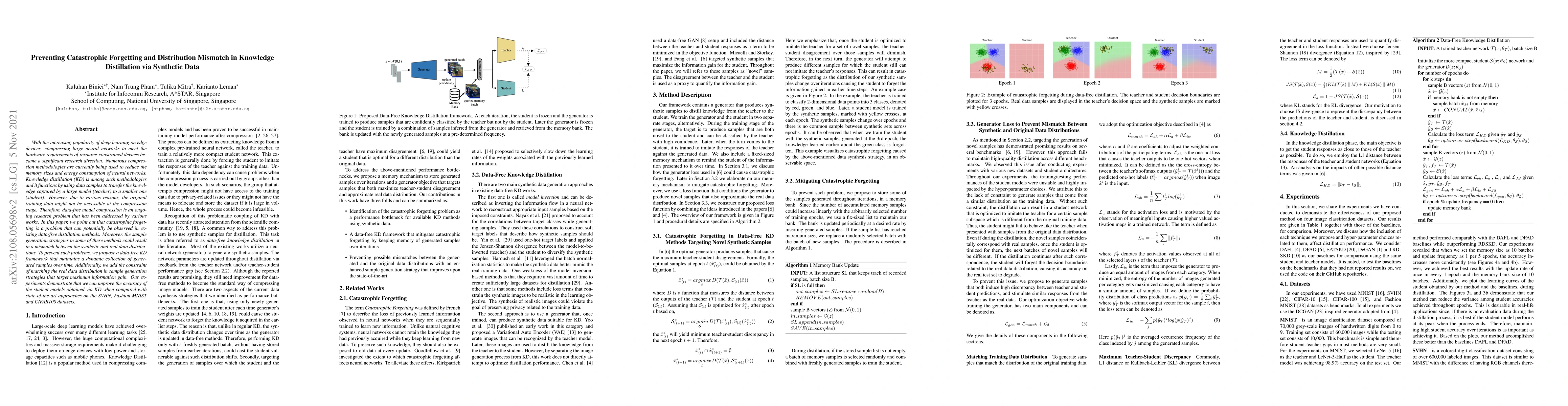 This research proposes a data-free knowledge distillation framework to prevent catastrophic forgetting and distribution mismatch in compressing large neural networks for edge devices. It maintains a dynamic collection of generated samples and ensures real data distribution matching in sample generation, improving student model accuracy on SVHN, Fashion MNIST, and CIFAR100 datasets compared to existing methods.