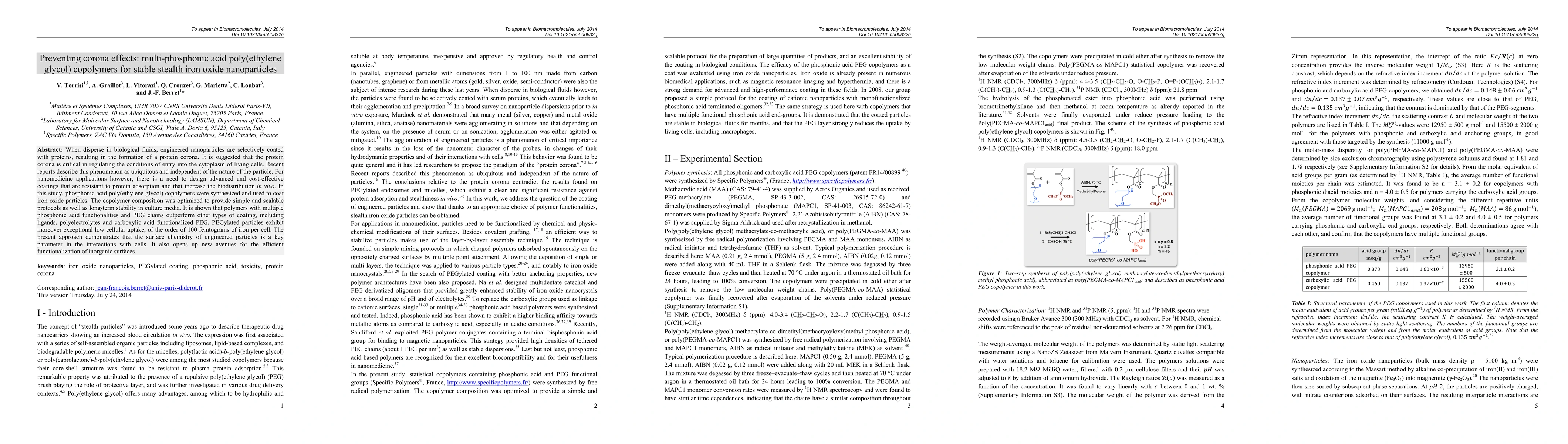 This study synthesizes phosphonic acid poly(ethylene glycol) copolymers to coat iron oxide nanoparticles, optimizing them to resist protein adsorption and enhance biodistribution. The resulting stealth nanoparticles show minimal cellular uptake, indicating effective prevention of corona formation, which is crucial for nanomedicine applications.