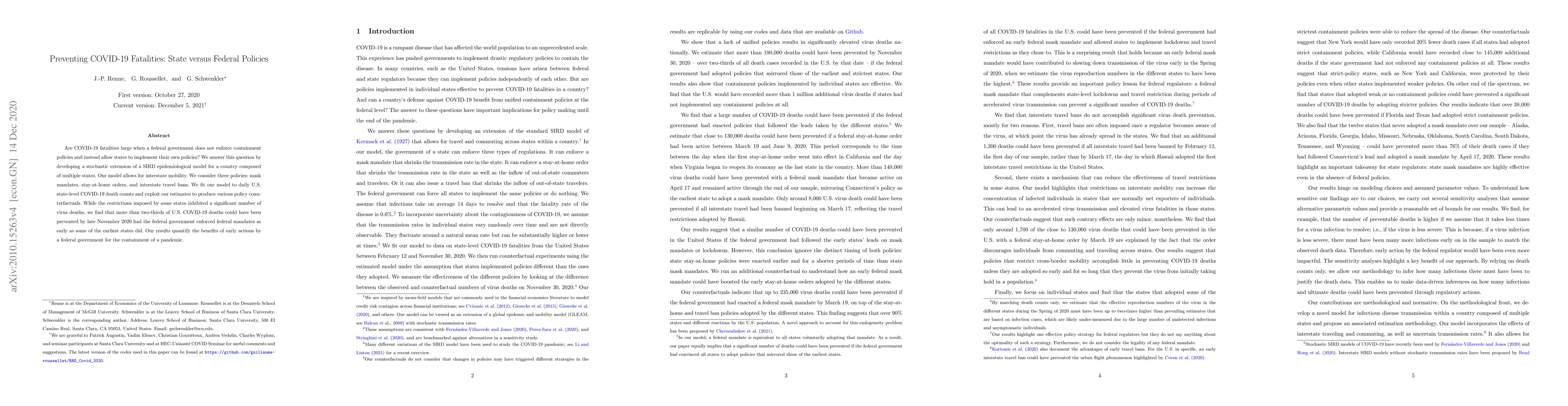 Are COVID-19 fatalities large when a federal government does not enforce containment policies and instead allow states to implement their own policies? We answer this question by developing a stochastic extension of a SIRD epidemiological model for a country composed of multiple states. Our model allows for interstate mobility. We consider three policies: mask mandates, stay-at-home orders, and interstate travel bans. We fit our model to daily U.S. state-level COVID-19 death counts and exploit our estimates to produce various policy counterfactuals. While the restrictions imposed by some states inhibited a significant number of virus deaths, we find that more than two-thirds of U.S. COVID-19 deaths could have been prevented by late November 2020 had the federal government enforced federal mandates as early as some of the earliest states did. Our results quantify the benefits of early actions by a federal government for the containment of a pandemic.
