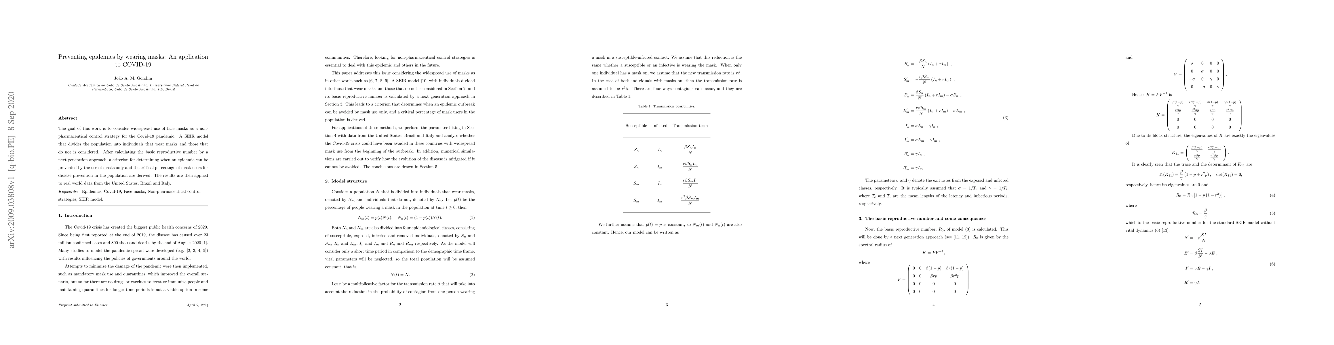 This paper explores the use of face masks as a non-pharmaceutical intervention to prevent COVID-19 epidemics using a SEIR model. It derives a criterion for epidemic prevention based on the critical percentage of mask users and applies these findings to real-world data from the U.S., Brazil, and Italy.