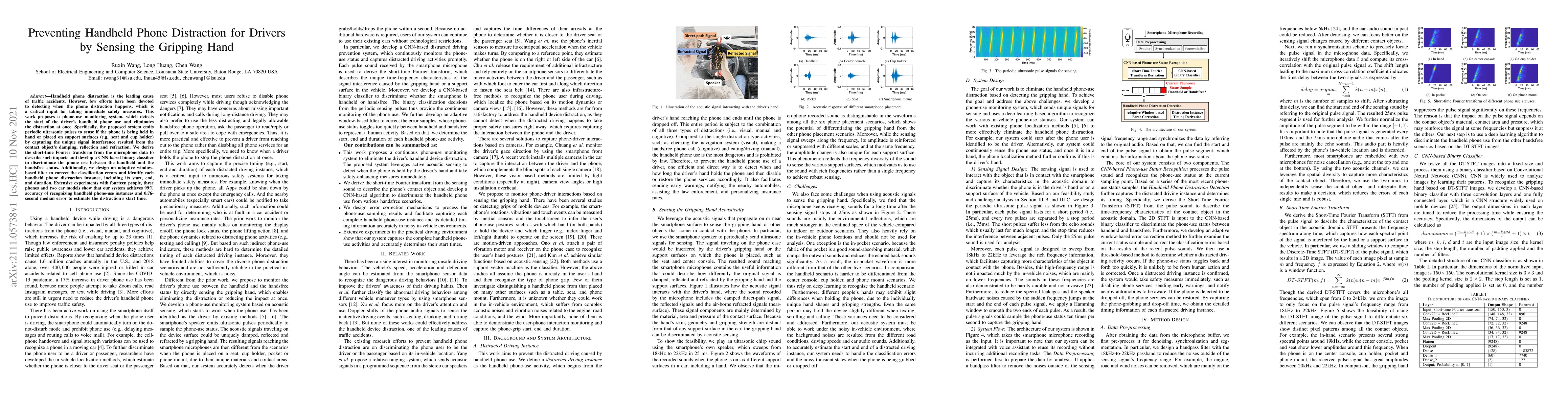 Handheld phone distraction is the leading cause of traffic accidents. However, few efforts have been devoted to detecting when the phone distraction happens, which is a critical input for taking immediate safety measures. This work proposes a phone-use monitoring system, which detects the start of the driver's handheld phone use and eliminates the distraction at once. Specifically, the proposed system emits periodic ultrasonic pulses to sense if the phone is being held in hand or placed on support surfaces (e.g., seat and cup holder) by capturing the unique signal interference resulted from the contact object's damping, reflection and refraction. We derive the short-time Fourier transform from the microphone data to describe such impacts and develop a CNN-based binary classifier to discriminate the phone use between the handheld and the handsfree status. Additionally, we design an adaptive window-based filter to correct the classification errors and identify each handheld phone distraction instance, including its start, end, and duration. Extensive experiments with fourteen people, three phones and two car models show that our system achieves 99% accuracy of recognizing handheld phone-use instances and 0.76-second median error to estimate the distraction's start time.