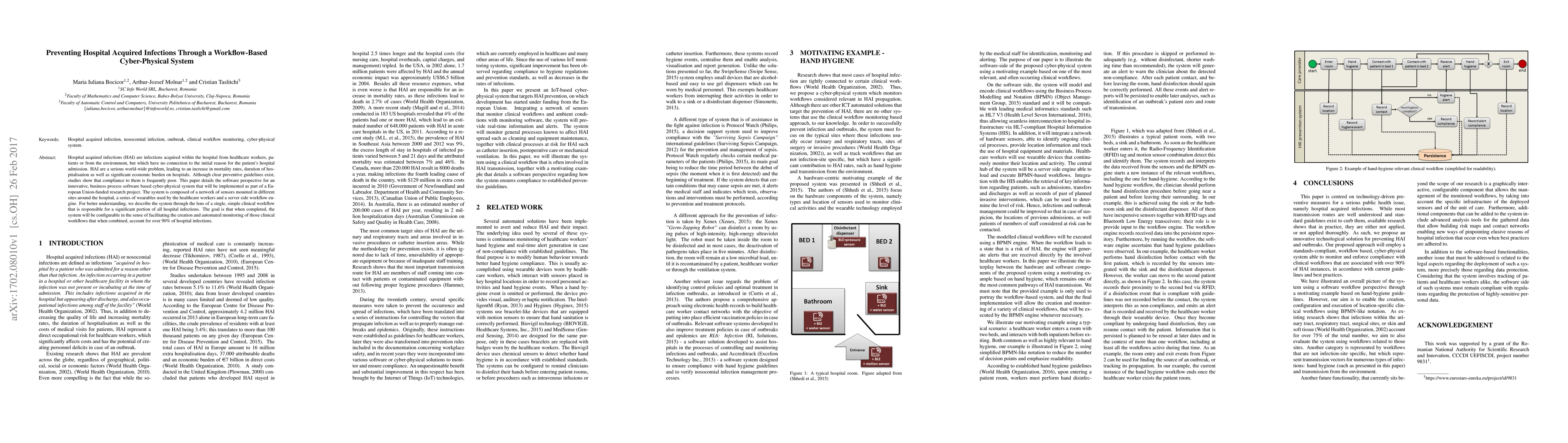 This paper proposes a cyber-physical system to prevent hospital acquired infections (HAI) by monitoring and optimizing clinical workflows through a network of sensors, wearables, and a workflow engine. The aim is to automate and enhance compliance with preventive guidelines to reduce HAI rates.
