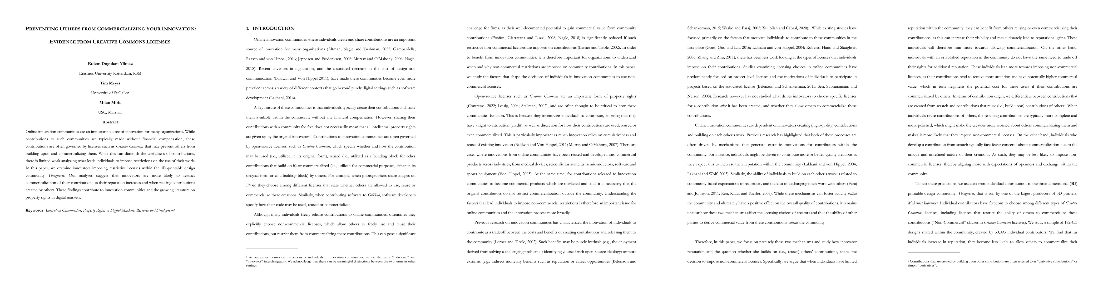 Online innovation communities are an important source of innovation for many organizations. While contributions to such communities are typically made without financial compensation, these contributions are often governed by licenses such as Creative Commons that may prevent others from building upon and commercializing them. While this can diminish the usefulness of contributions, there is limited work analyzing what leads individuals to impose restrictions on the use of their work. In this paper, we examine innovators imposing restrictive licenses within the 3D-printable design community Thingiverse. Our analyses suggest that innovators are more likely to restrict commercialization of their contributions as their reputation increases and when reusing contributions created by others. These findings contribute to innovation communities and the growing literature on property rights in digital markets.