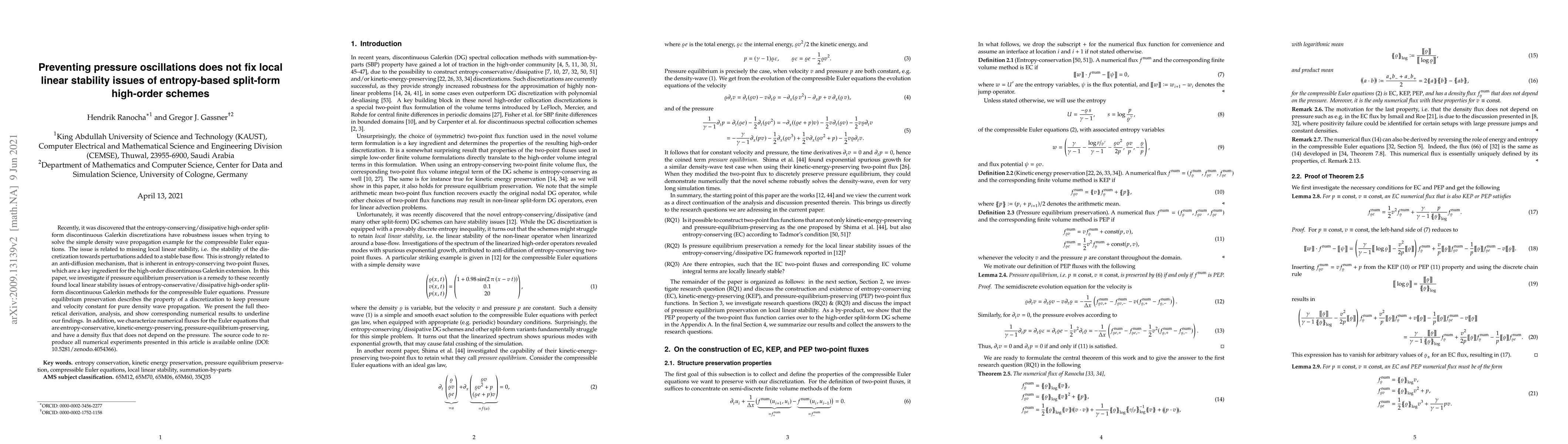 Recently, it was discovered that the entropy-conserving/dissipative high-order split-form discontinuous Galerkin discretizations have robustness issues when trying to solve the simple density wave propagation example for the compressible Euler equations. The issue is related to missing local linear stability, i.e. the stability of the discretization towards perturbations added to a stable base flow. This is strongly related to an anti-diffusion mechanism, that is inherent in entropy-conserving two-point fluxes, which are a key ingredient for the high-order discontinuous Galerkin extension. In this paper, we investigate if pressure equilibrium preservation is a remedy to these recently found local linear stability issues of entropy-conservative/dissipative high-order split-form discontinuous Galerkin methods for the compressible Euler equations. Pressure equilibrium preservation describes the property of a discretization to keep pressure and velocity constant for pure density wave propagation. We present the full theoretical derivation, analysis, and show corresponding numerical results to underline our findings. In addition, we characterize numerical fluxes for the Euler equations that are entropy-conservative, kinetic-energy-preserving, pressure-equilibrium-preserving, and have a density flux that does not depend on the pressure. The source code to reproduce all numerical experiments presented in this article is available online (DOI: 10.5281/zenodo.4054366).