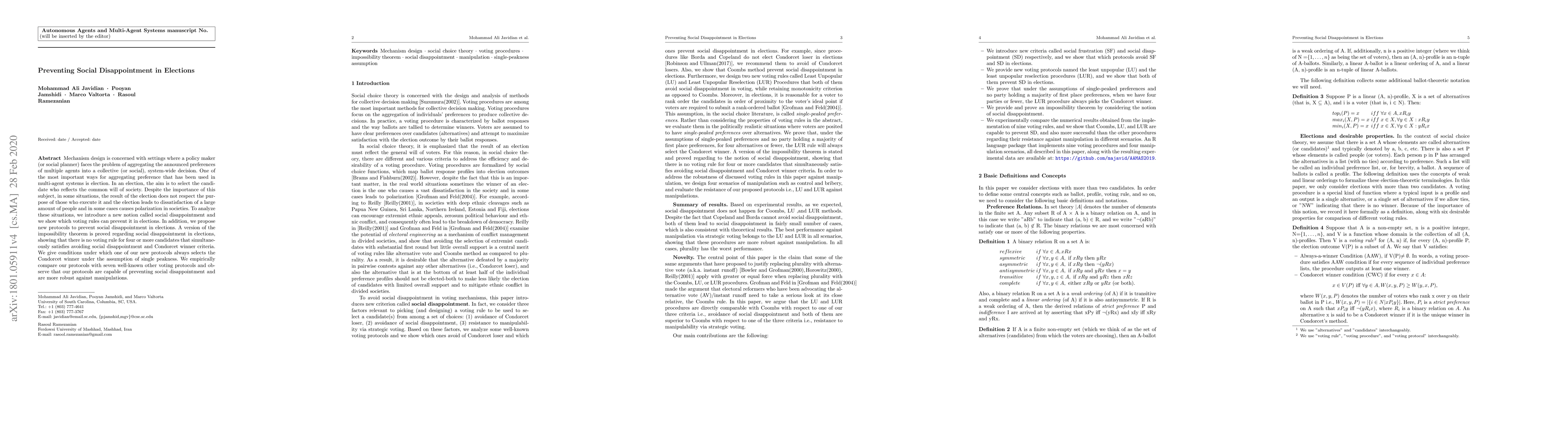 Mechanism design is concerned with settings where a policymaker (or social planner) faces the problem of aggregating the announced preferences of multiple agents into a collective (or social), system-wide decision. One of the most important ways for aggregating preference that has been used in multi-agent systems is election. In an election, the aim is to select the candidate who reflects the common will of society. Despite the importance of this subject, in some situations, the result of the election does not respect the purpose of those who execute it and the election leads to dissatisfaction of a large amount of people and in some cases causes polarization in societies. To analyze these situations, we introduce a new notion called social disappointment and we show which voting rules can prevent it in elections. In addition, we propose new protocols to prevent social disappointment in elections. A version of the impossibility theorem is proved regarding social disappointment in elections, showing that there is no voting rule for four or more candidates that simultaneously satisfies avoiding social disappointment and Condorcet winner criteria. We give conditions under which one of our new protocols always selects the Condorcet winner under the assumption of single peakedness. We empirically compare our protocols with seven well-known other voting protocols and observe that our protocols are capable of preventing social disappointment and are more robust against manipulations.