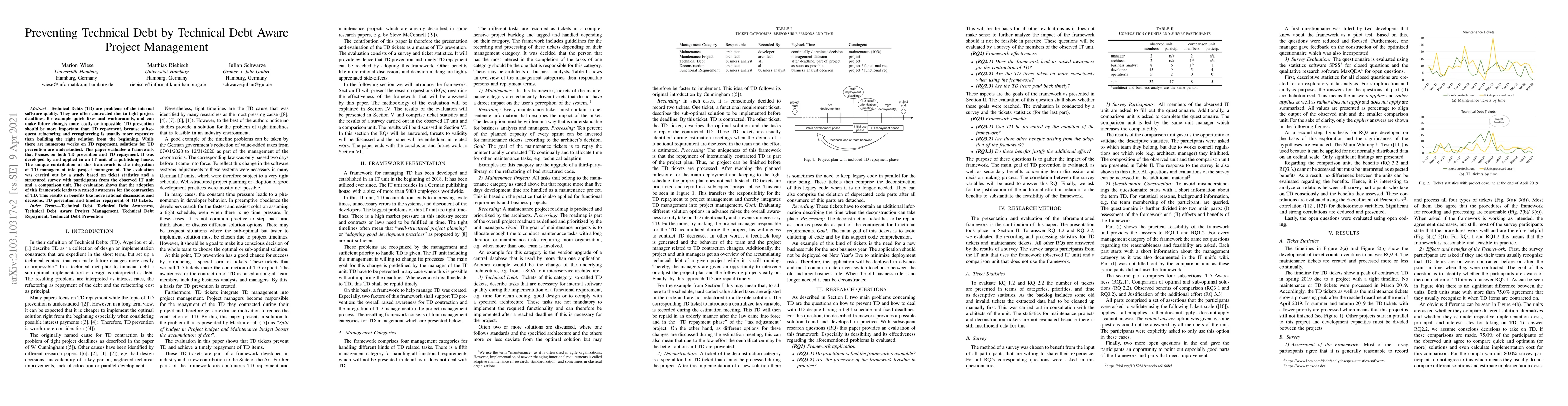 Technical Debts (TD) are problems of the internal software quality. They are often contracted due to tight project deadlines, for example quick fixes and workarounds, and can make future changes more costly or impossible. TD prevention should be more important than TD repayment, because subsequent refactoring and reengineering is usually more expensive than building the right solution from the beginning. While there are numerous works on TD repayment, solutions for TD prevention are understudied. This paper evaluates a framework that focuses on both TD prevention and TD repayment. It was developed by and applied in an IT unit of a publishing house. The unique contribution of this framework is the integration of TD management into project management. The evaluation was carried out by a study based on ticket statistics and a structured survey with participants from the observed IT unit and a comparison unit. The evaluation shows that the adoption of this framework leads to a raised awareness for the contraction of TD. This results in benefits like more rational discussions and decisions, TD prevention and timelier repayment of TD tickets.